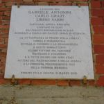 Si tratta di una lastra in marmo, di forma quadrata, apposta su un edificio privato mediante quattro ganci di bronzo. Ricorda la fucilazione di tre partigiani avvenuta l’8 Giugno 1944 nella vicina Piazza G. Garibaldi per mano di un plotone formato da militi fascisti della G.N.R. (Guardia Nazionale Repubblicana). L’epigrafe reca incisi i nomi dei tre Caduti e la data della loro morte. I caratteri sono stati riempiti con vernice di color nero.