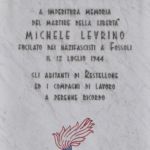 - A IMPERITURA MEMORIA DEL MARTIRE DELLA LIBERTA' MICHELE LEVRINO FUCILATO DAI NAZIFASCISTI A FOSSOLI IL 12 LUGLIO DEL 1944. GLI ABITANTI DI RESTRELLONE ED I COMPAGNI DI LAVORO A PERENNE RICORDO.