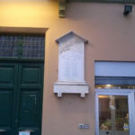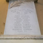 - Lapide artistica di marmo con l’iscrizione incisa e verniciata di nero. In alto ha una cornice disposta a tettoia, in basso una mensola a guisa di altare entrambe con il bordo sagomato.