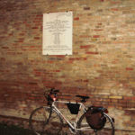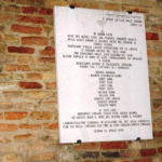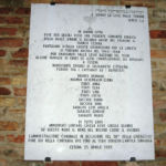 - Lapide di marmo bianco con scritte incise ed evidenziate in vernice nera, posta su un antico muro in cotto, fermata da perni in bronzo.