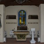 Simboli religiosi cristiani: finestrone con vetri istoriati raffigurante la croce.