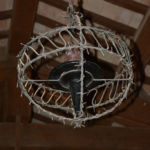 All'interno elmetti, un lampadario fatto con il filo spinato.