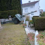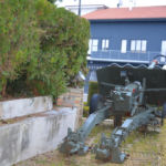 Edificio fatto a mattoncini con all'esterno cannone, proiettili.