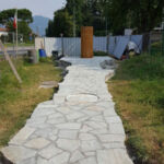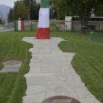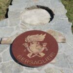 La fondamenta in superficie è ricoperta con pietra luserna posata a mosaico stuccato a cemento e sabbia fine del Po, dalla fondamenta parte un vialetto lungo 11 metri e largo 110 centimetri a forma irregolare con dislivello che parte da 50 centimetri e arriva all’inizio del vialetto a 10 centimetri, anche il vialetto è in pietra luserna posata a mosaico. Percorrendo il vialetto dal suo inizio dopo circa un metro e mezzo è stato incastonato nel cemento per 3 centimetri un disco di granito rosso del diametro di 80 centimetri e al suo interno è incastonato il fregio dei Bersaglieri in marmo giallo tagliato ad acqua e sotto il fregio la dicitura Bersaglieri.