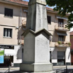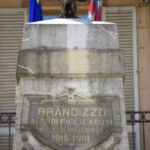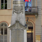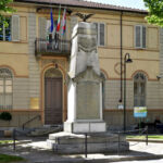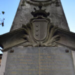 - L'aquila ad ali spiegate è simbolo di vittoria. Lo stemma comunale riporta al suo interno tre stelle sovrapposte, affiancate da quattro bande verticali. Sotto la lastra dedicatoria superiore è presente un decoro floreale a bassorilievo.