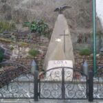Base e blocco in pietra; croce, aquila e un simbolo con due fucili in bronzo.