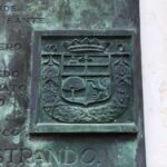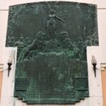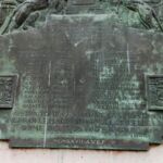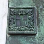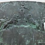 - La lapide superiore è formata da una lastra sagomata in marmo chiaro su cui è agganciata una lastra in bronzo fuso, analogamnete sagomata, con immagini in bassorilievo e con iscrizioni incise.