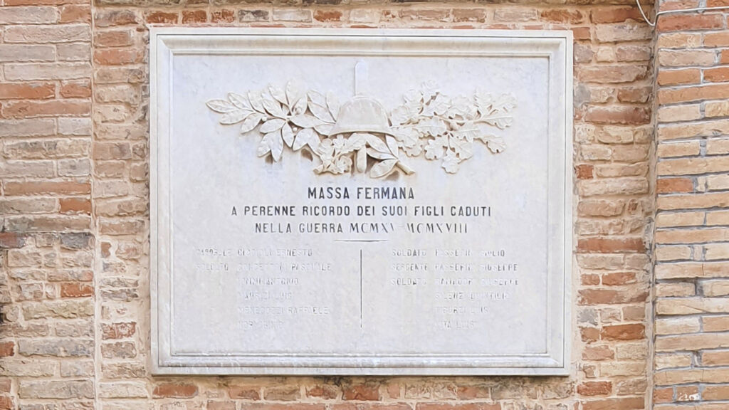 La lastra, di forma rettangolare profilata da cornice con modanatura arrotondata, è affissa sul lato sinistro della torre dell’orologio a Massa Fermana in posizione simmetrica rispetto a quella dedicata ai caduti della ...
