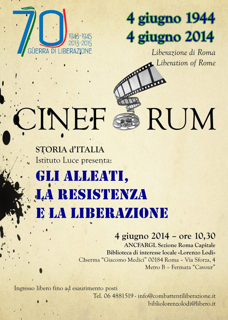 La proiezione sarà preceduta da una introduzione alla Guerra di Liberazione e testimonianze dai nostri reduci della V e VIII armate (Divisioni Ausiliari, Genio ferrovieri, Gruppi di combattimento).