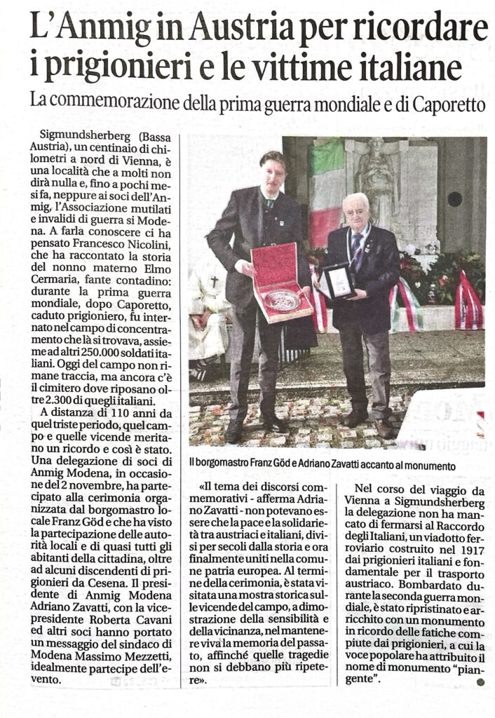 MODENA – Sigmundsherberg (Bassa Austria), un centinaio di chilometri a nord di Vienna, è una località che a molti non dirà nulla e, fino a pochi mesi fa, neppure ai soci dell’Anmig, l’Associazione mutilati e invalidi di guerra di Modena. A farla conoscere…