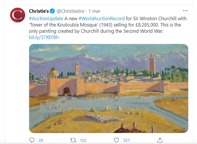 ROMA - Un dipinto dello storico premier britannico Winston Churchill (1874-1965) è stato venduto all'asta a Londra per l'incredibile cifra di 8,285 milioni di sterline! "La Torre della Moschea di Koutoubia" - questo il nome ...