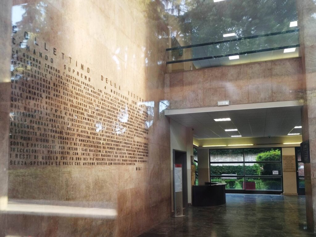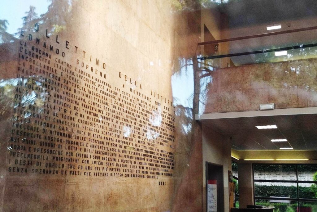 Sulla parete frontale nell’atrio di ingresso della Facoltà di Ingegneria dell’Università di Bologna è riportata in carattere maiuscolo a rilievo il Bollettino di guerra firmato dal Generale Armando Diaz per comunicare la fine vittoriosa della Grande Guerra il 4 novembre 1918.