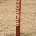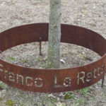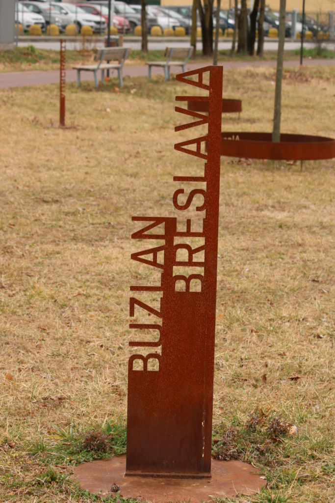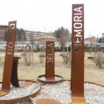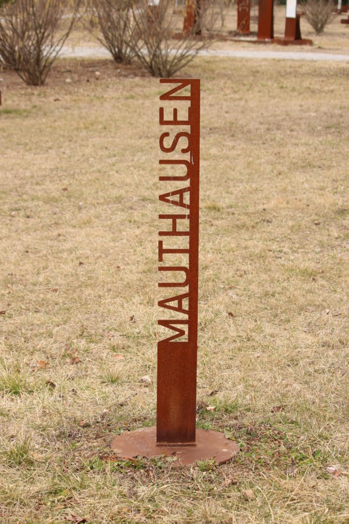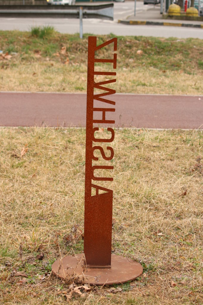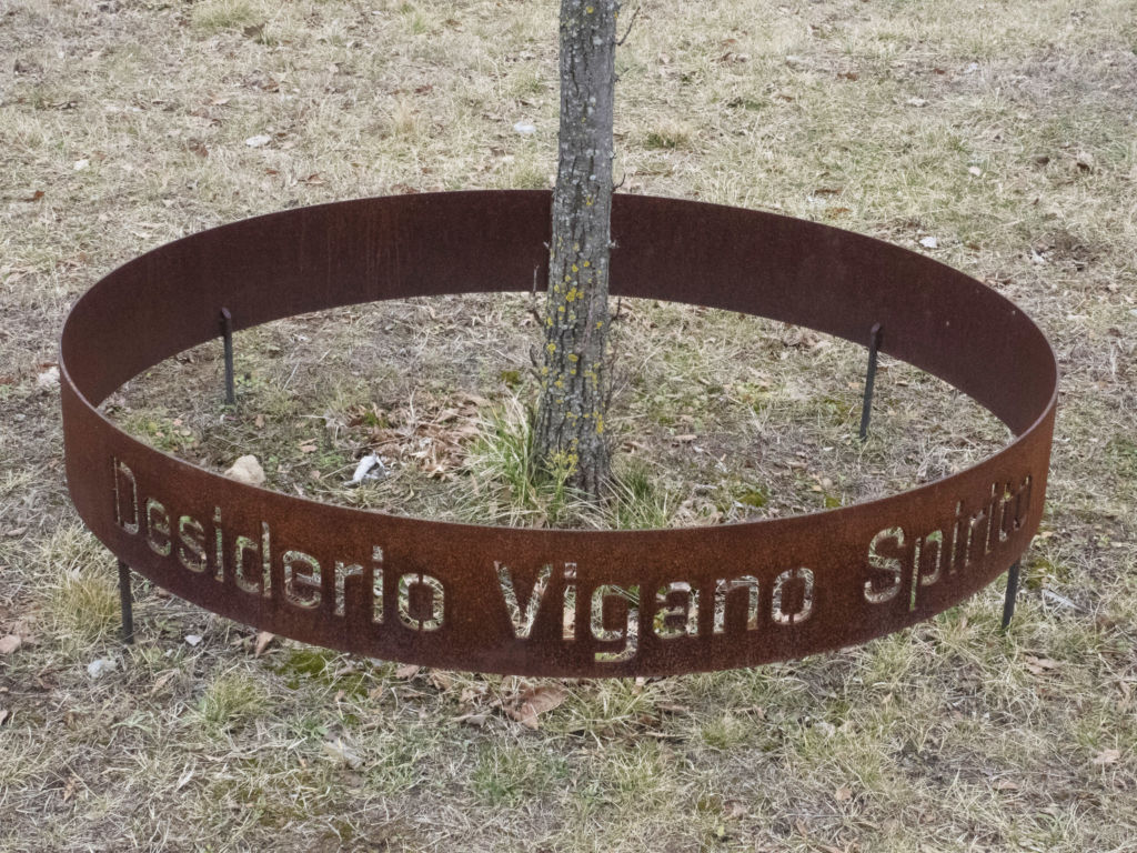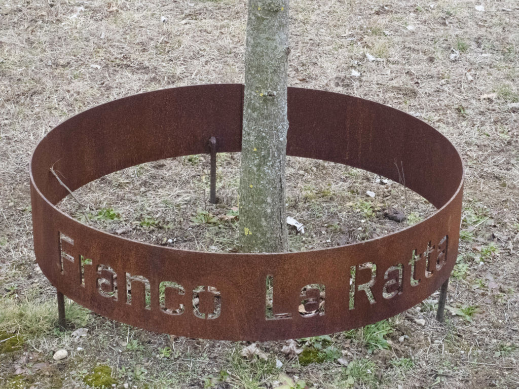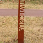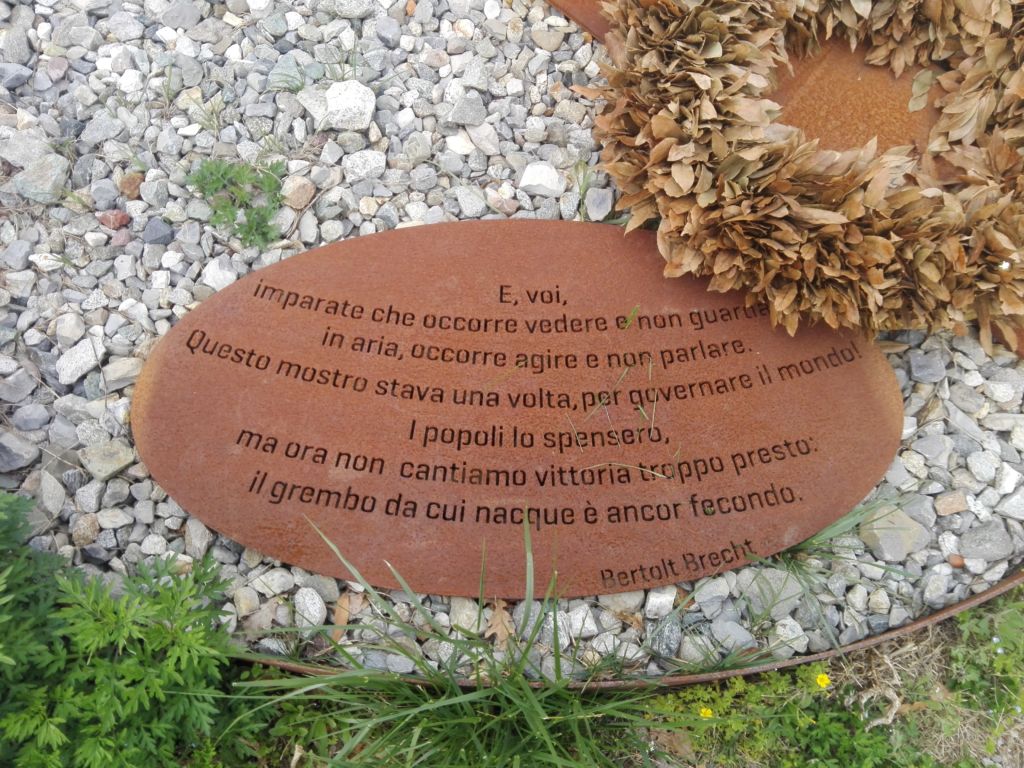 - I cerchi che circondano gli alberi, i landmark verticali dei campi di concentramento e della scritta Bosco della memoria così come l'iscrizione di Brecht sono in acciaio corten, un materiale molto particolare, molto resistente sia alla corrosione che alla trazione.
