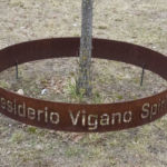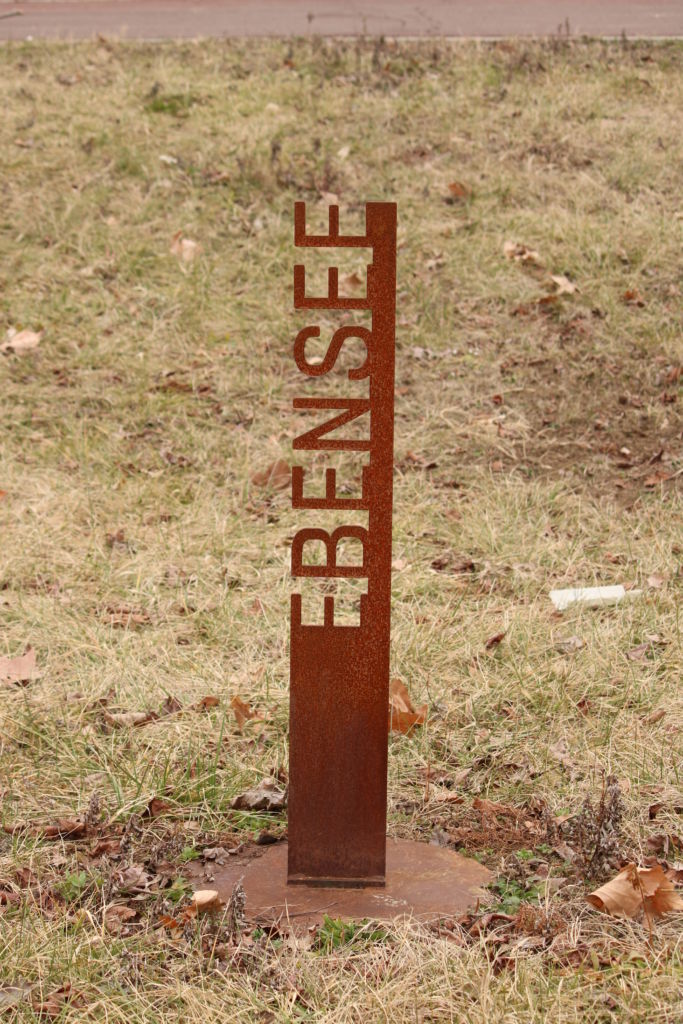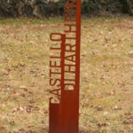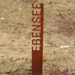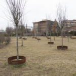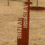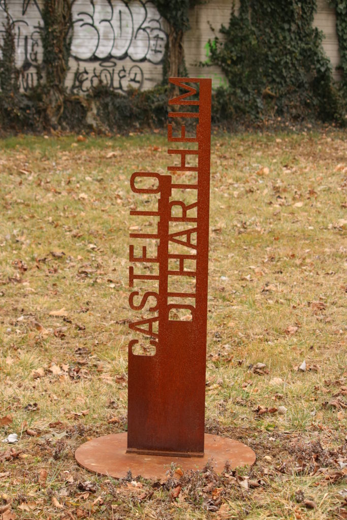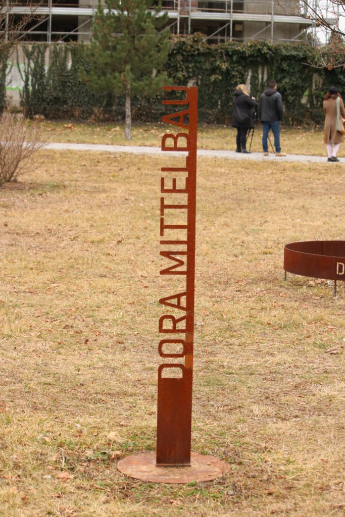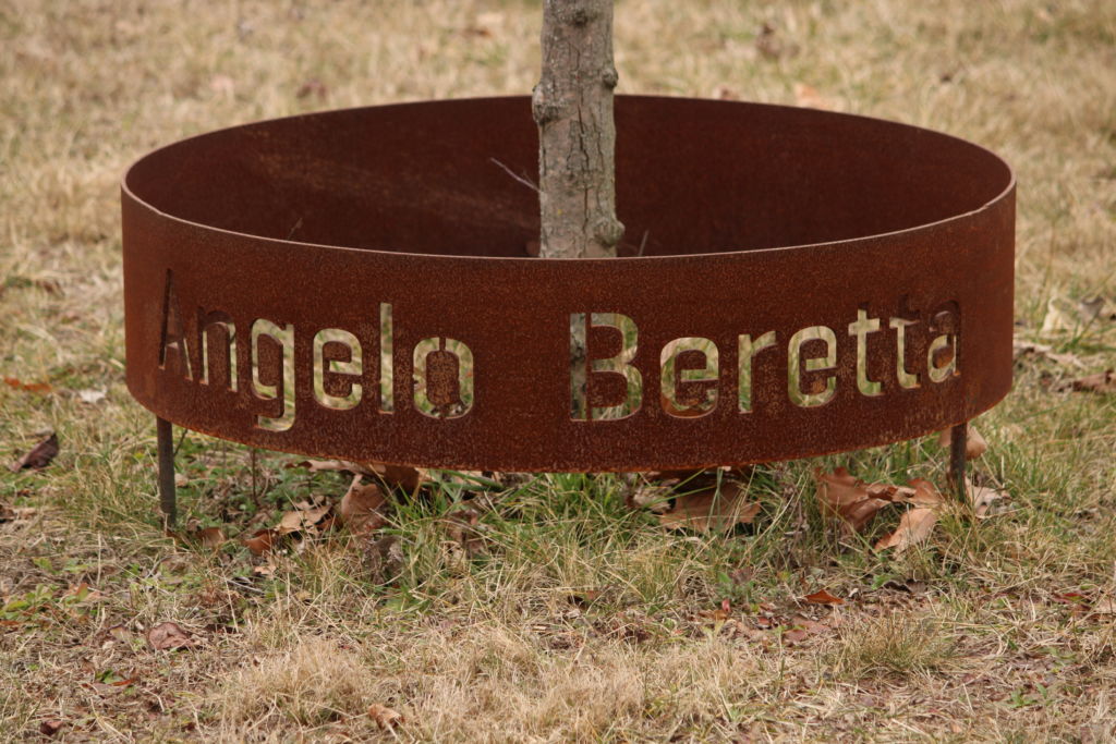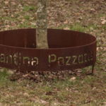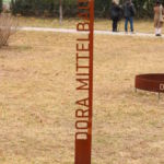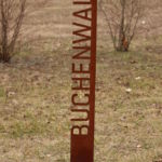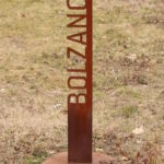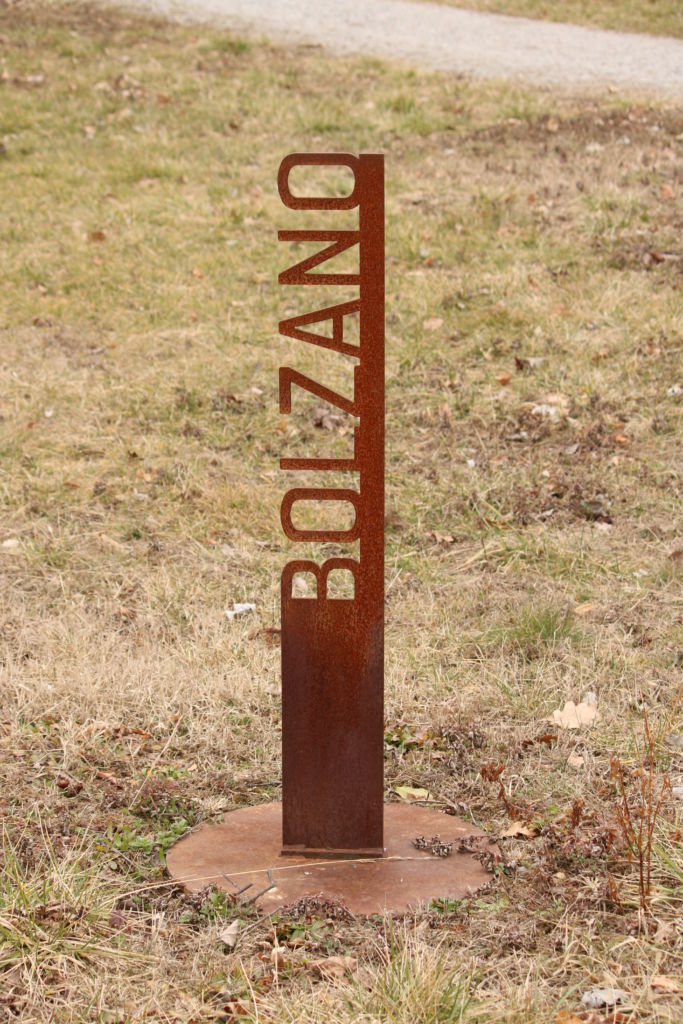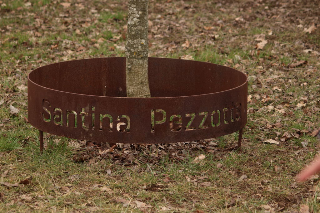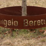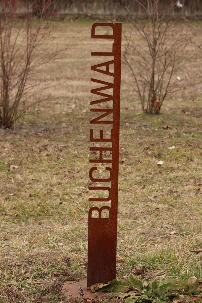 - I cerchi che circondano gli alberi, i landmark verticali dei campi di concentramento e della scritta Bosco della memoria così come l'iscrizione di Brecht sono in acciaio corten, un materiale molto particolare, molto resistente sia alla corrosione che alla trazione.