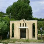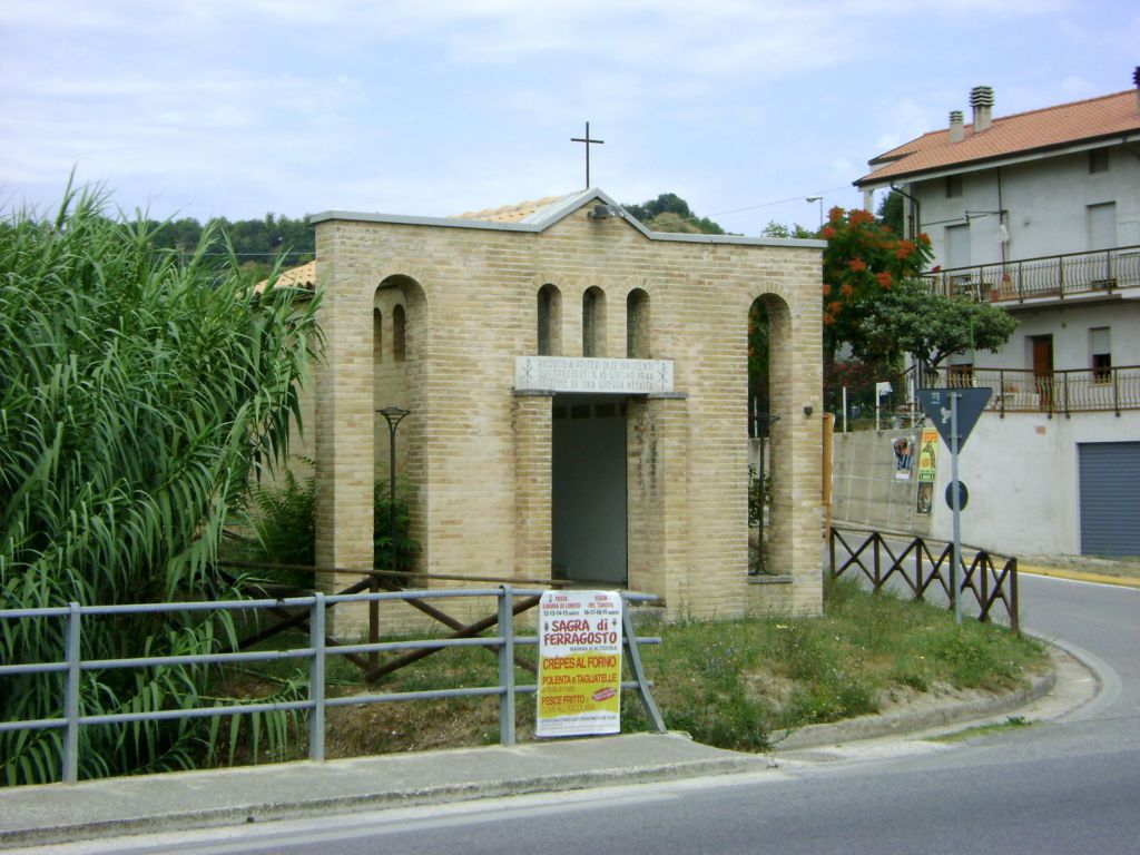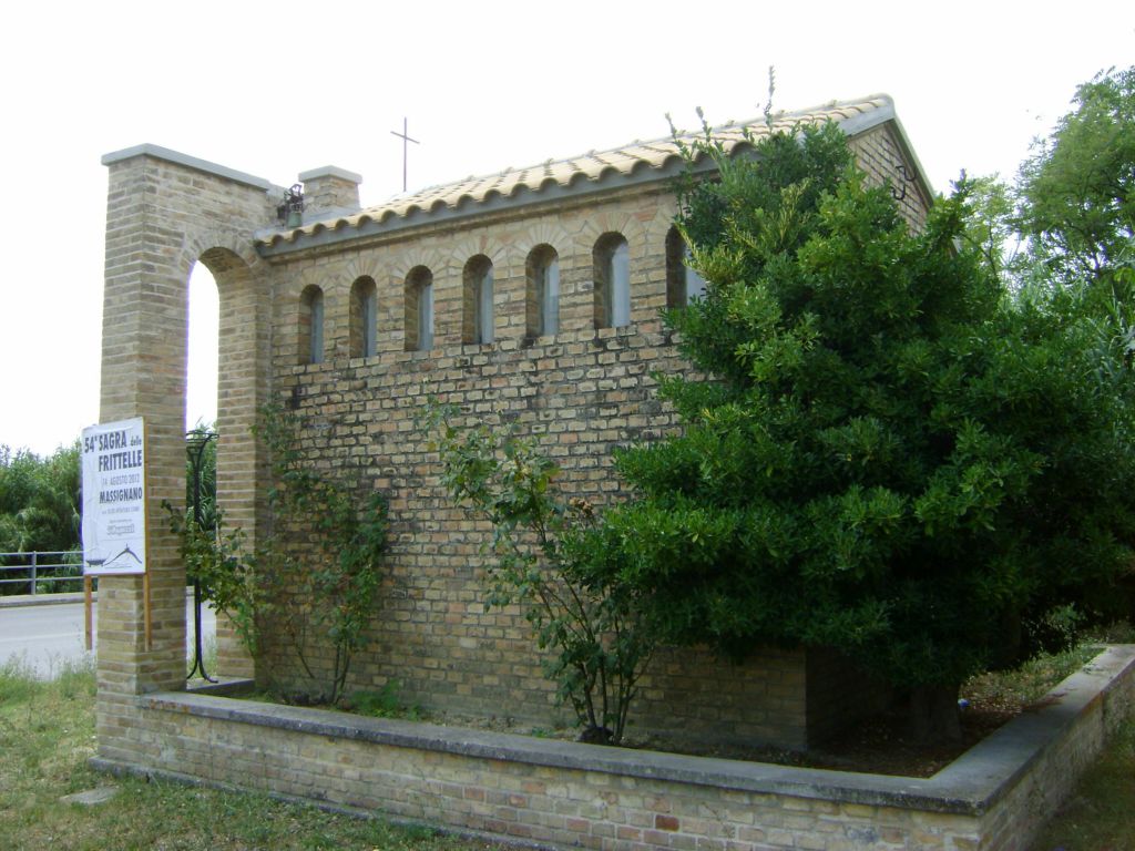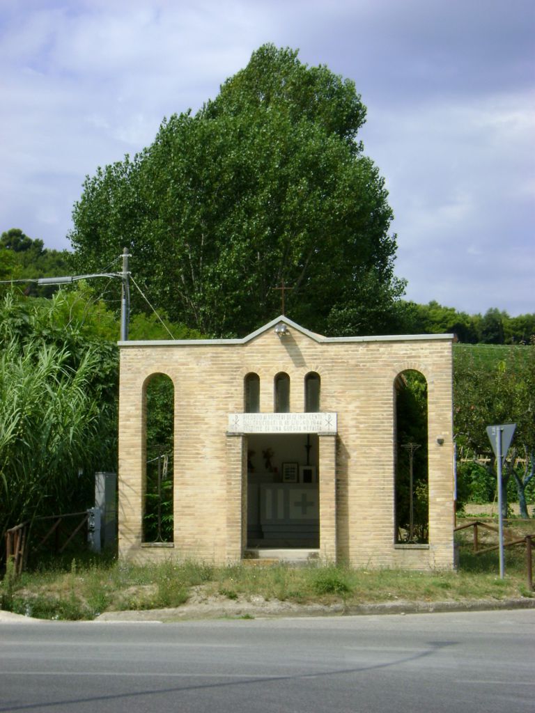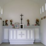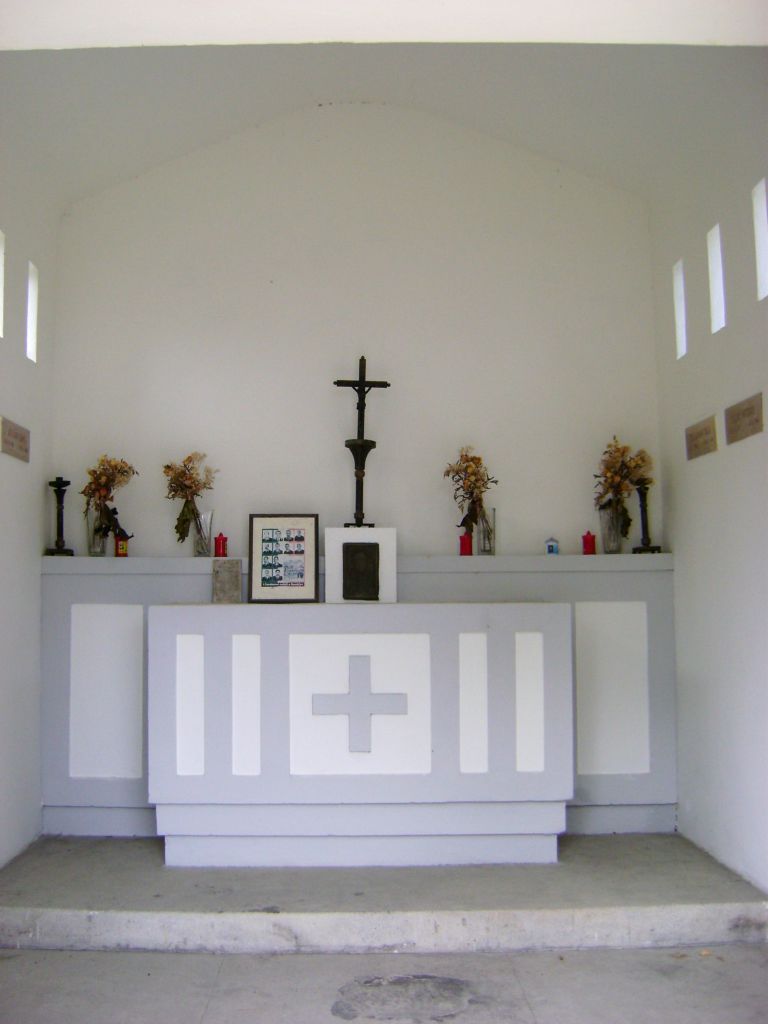 - Croce cristiana sopra la copertura della cappella. Crocifisso all'interno della stessa. Croce con bracci simmetrici scolpita in bassorilievo sull'altare. Simboli della Pace incisi sulla lastra marmorea posta sopra l'ingresso della cappella.