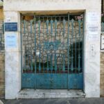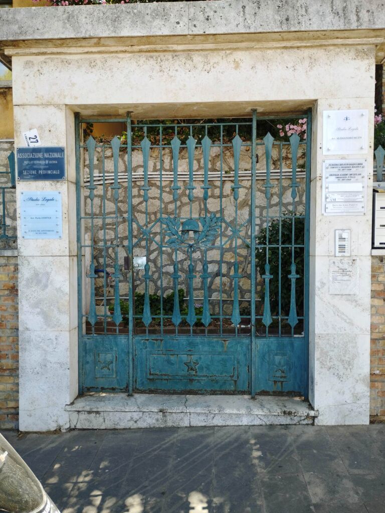 - Il cancello in ferro battuto presenta al centro un elmetto di fante circondato da due rami di alloro e di quercia. Le aste verticali terminano alternativamente con dei gladi (sia in alto che in basso). Ai due lati dell’elmetto sono presenti due stelle a cinque punte che si ripetono come motivo anche nelle tre parti chiuse inferiori.