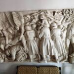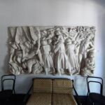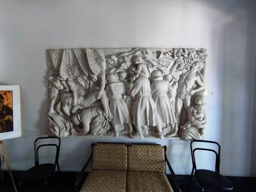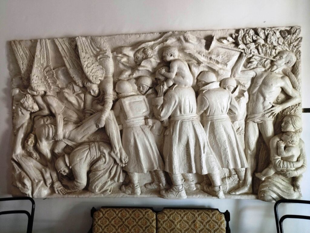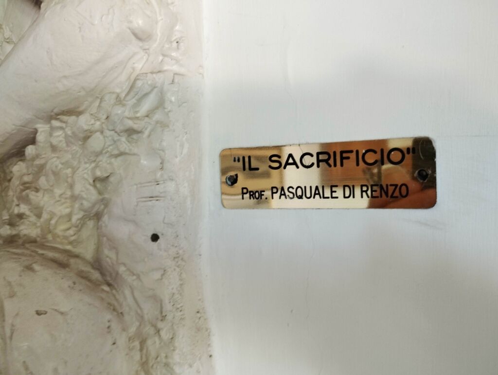 L’altorilievo nell’ingresso si intitola “Il Sacrificio” ed è opera dell’artista Pasquale Di Renzo. Esso raffigura sulla sinistra due angeli che depongono i corpi nudi di soldati morti. La deposizione è seguita da un manipolo di soldati in divisa, di cui uno porta sulle spalle un bambino nudo. Sull’estrema destra sono presenti un trombettista e una madre con il figlio in braccio.