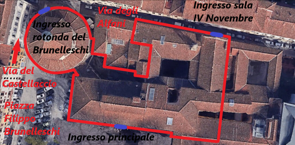 - Piazza Filippo Brunelleschi, 1 (accesso del poliambulatorio), 2 (ingresso principale), 3; via degli Alfani, 39 (accesso della sala IV Novembre), 43, 49; via del Castellaccio (ingresso della Rotonda del Brunelleschi)