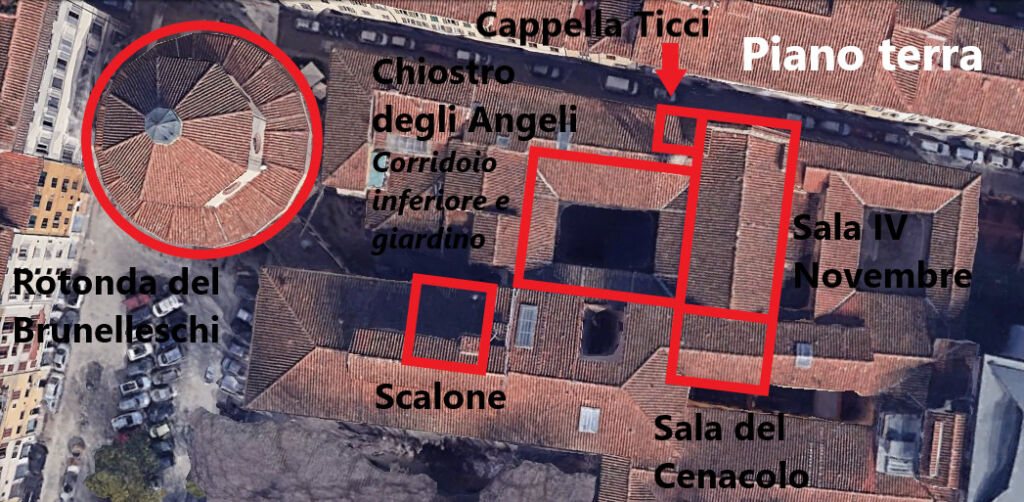 Nel 1932 l'area acquisita comprendeva il braccio settecentesco del complesso religioso, la Cappella Ticci, l'ex Chiesa di Santa Maria degli Angeli, il chiostro degli Angeli o di ponente, metà dell'ex refettorio monastico e la sacrestia. A queta operazione partecipò anche l'Opera Nazionale per gli Invalidi di Guerra (ONIG) (1917 - 1979), che dette un contributi all'ANMIG dell'11% e che acquisì l'area sinistra dell'edificio rettangolare affacciato su piazza Brunelleschi.