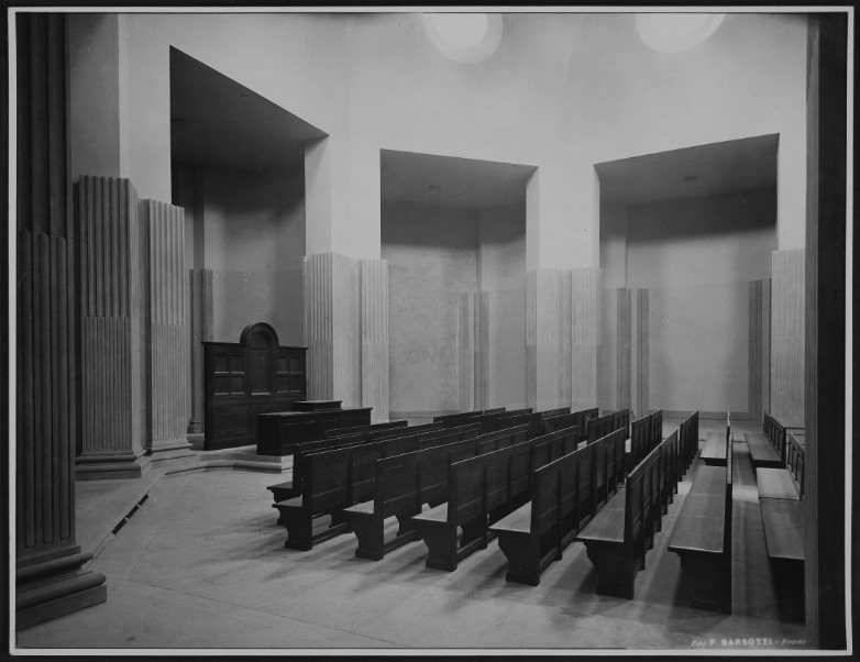 L'arredo ligneo interno, ancora oggi conservato, fu eseguito su disegno di Sabatini.