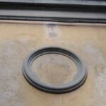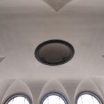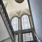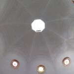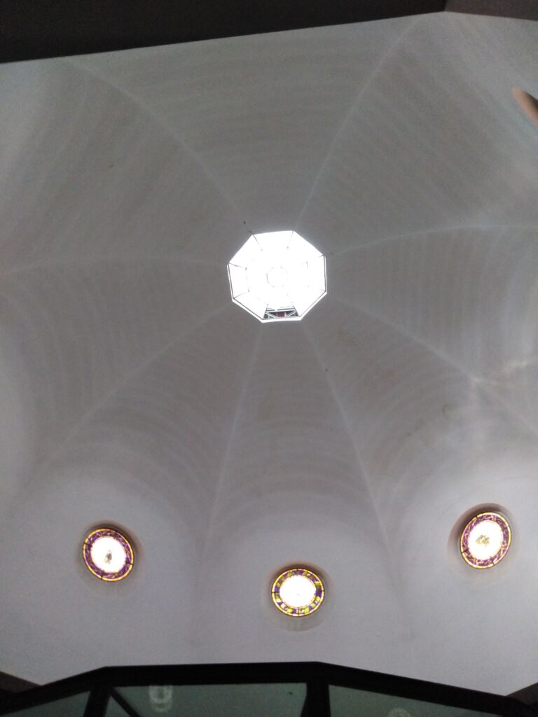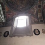 Accesso in legno e matallo, bordi circolari delle vetrate in mattoni, cornici interne in pietra serena, pietrame in pietra serena di Santa Brigida, vetrata posta a chiusura della cupola in metallo e vetro, vetrate che chiudono gli oculi del tamburo in metallo e vetro