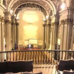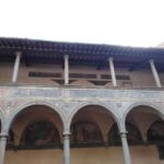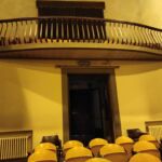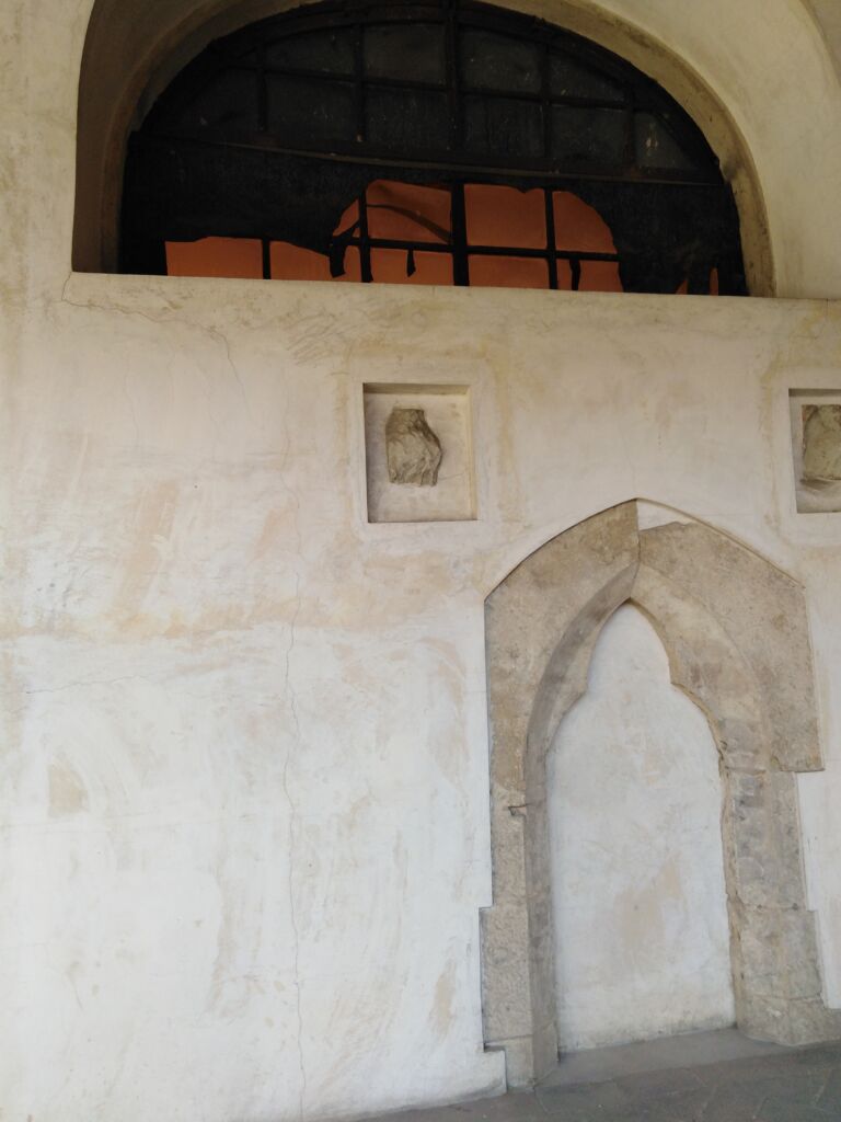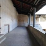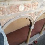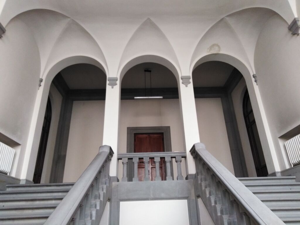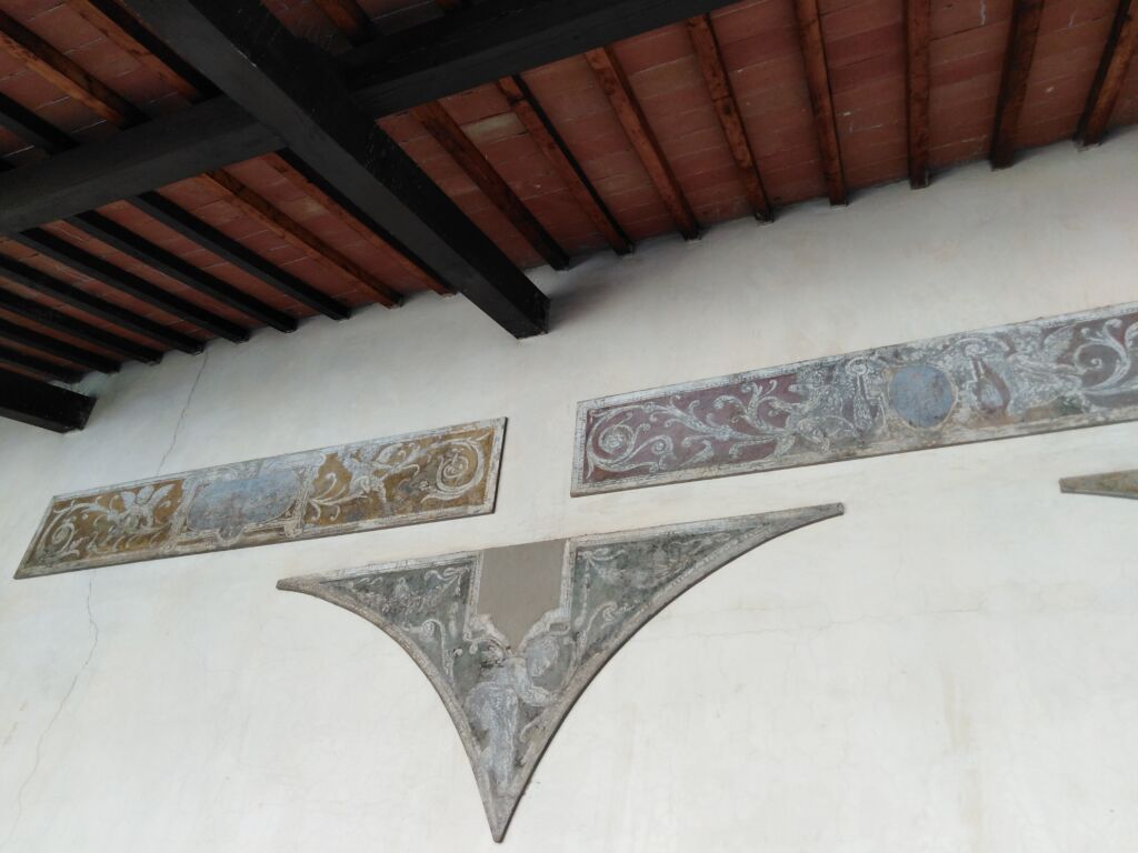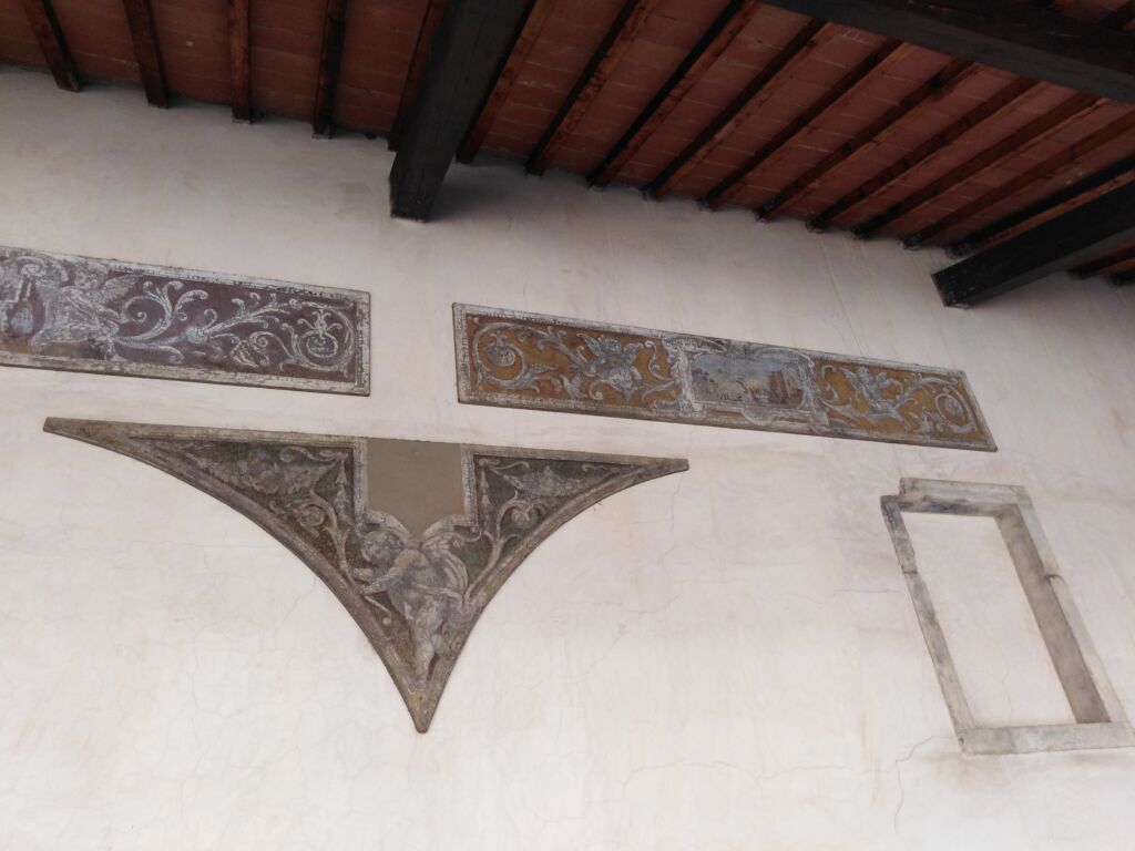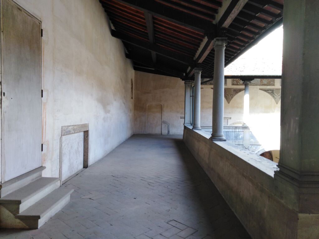 Busti in marmo, elementi decorativi in pietra, finestra posta sotto l'affresco "Sogno di Romualdo" di legno e vetro, parte centrale scoperta in pietra grigia, pavimento sotto i portici in cotto