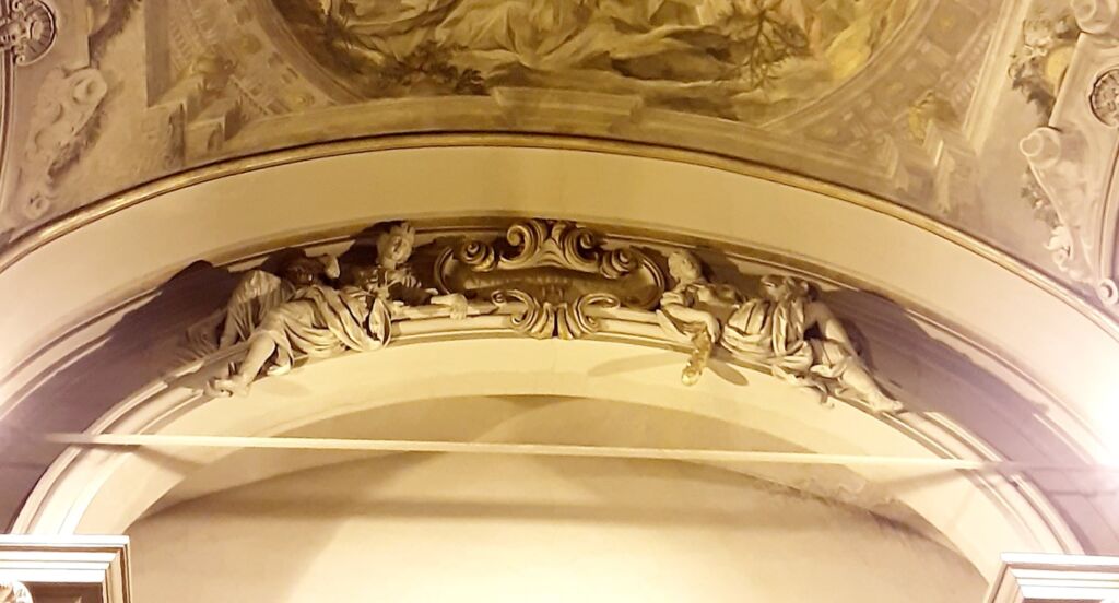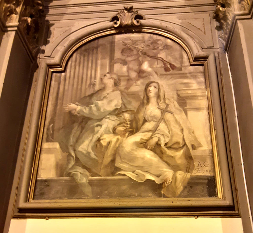 Sulle pareti vediamo a sinistra "la Carità" e a destra "la Fede e la Speranza", sempre di Gherardini. Anche questi dipinti sono databili agli inizi del '700. La prima è seduta sullo scalino di un edificio classico, ha il braccio alzato e tiene in grembo un bambino; alla sua sinistra è visibile un altro bambino che sembra voler trattenere il drappo azzurro e drappeggiato mentre alla sua destra c'è un puttino che, camminando, beve da una coppa. Sullo sfondo si nota un vaso con il fuoco acceso. La Speranza viene raffigurata inginocchiata di profilo con lo sguardo rivolto verso l'alto. La Fede è seduta, ha la testa coperta e porta simboli eucaristici in mano. Sulle ultime due virtù volteggiano due angeli.