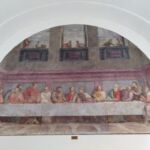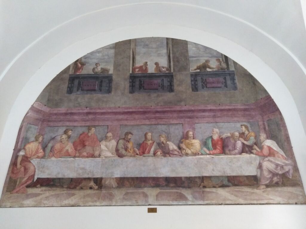 Il momento descritto da Ridolfo del Ghirlandaio nell'affresco "Ultima cena" (1543) è tratto dal Vangelo secondo Giovanni: Gesù afferma che qualcuno di loro lo tradirà e che sarà quello a cui darà un boccone di pane inzuppato. A destra di Gesù Giovanni, Giacomo, simile a Gesù in quanto suo cugino. A sinistra Giuda, Pietro e Tommaso. Al momento della costruzione della Casa del Mutilato l'affresco fu staccato dalla parete originaria e ricollocato sul muro che delimitava la proprietà dell'ANMIG.