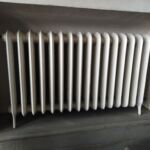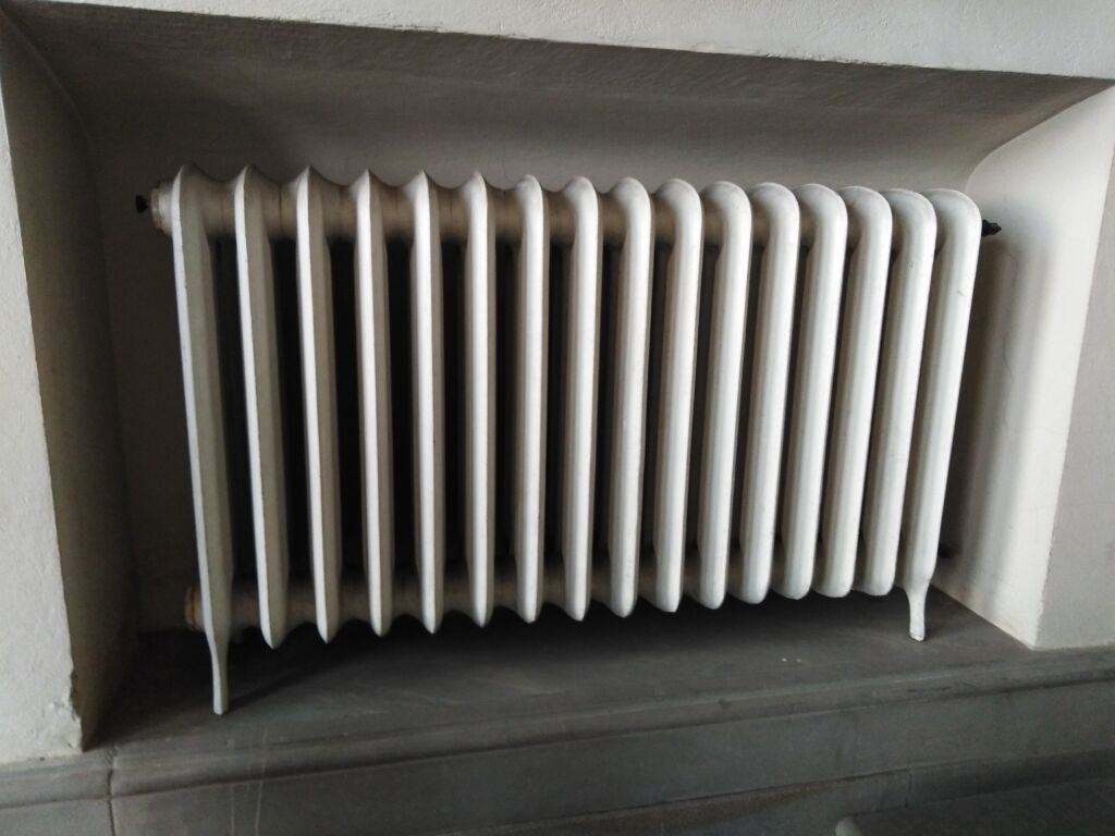 Mobilio e tavolo in legno, sedie al centro della stanza in plastica e tessuto, sedie intorno al tavolo in legno e pelle, supporti per l'illuminazione in metallo, targa esterna in metallo, termosifoni in metallo