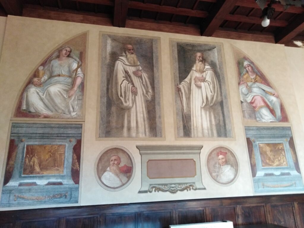Gli affreschi "La Fede", "La Teologia", "San Benedetto" e "San Romualdo", si trovavano nel corridoio del convento, in cui incorniciavano il finestrone di testata del piano terra ("Andito al piano terreno. Ai lati e sopra al finestrone: affreschi a chiaroscuro raffiguranti San Benedetto, San Romualdo, la Fede e la Teologia").