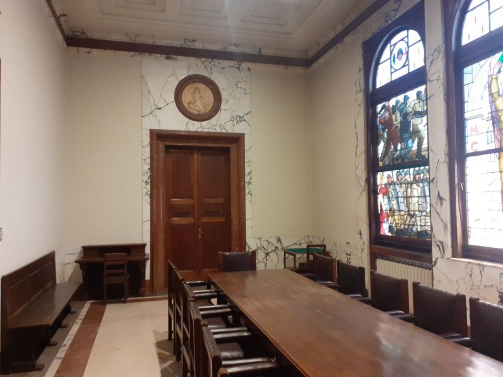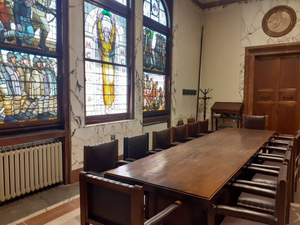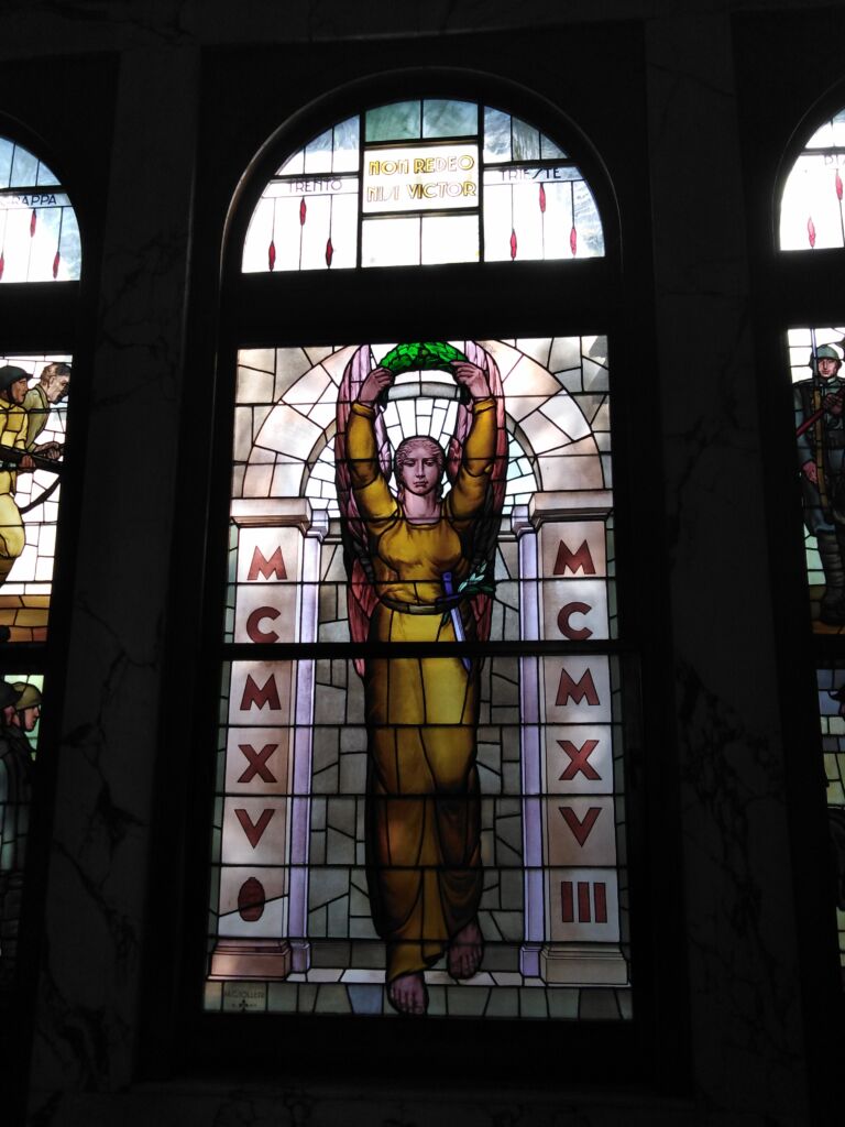 La vetrata della sala del Consiglio presenta varie vetrate dedicate alla prima guerra mondiale: al centro la Vittoria alata che alza al cielo una corona d'alloro con ai lati le date del conflitto in numeri romani (MXMXV e MCMXVIII) e nel quadro in alto a sinistra ("L'assalto con le baionette e la resistenza contro gli austriaci") è raffigurato l'assalto contro il nemico austriaco, rappresentato dal soldato biondo.