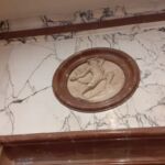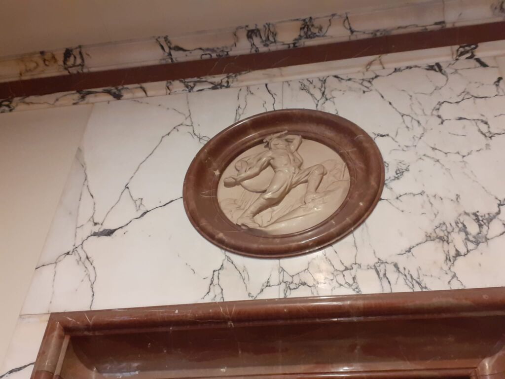 Alla sommità delle pareti ci sono tre bassorilievi in marmo rosa con cornici in granito rosso raffiguranti: