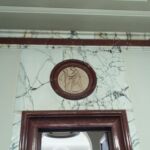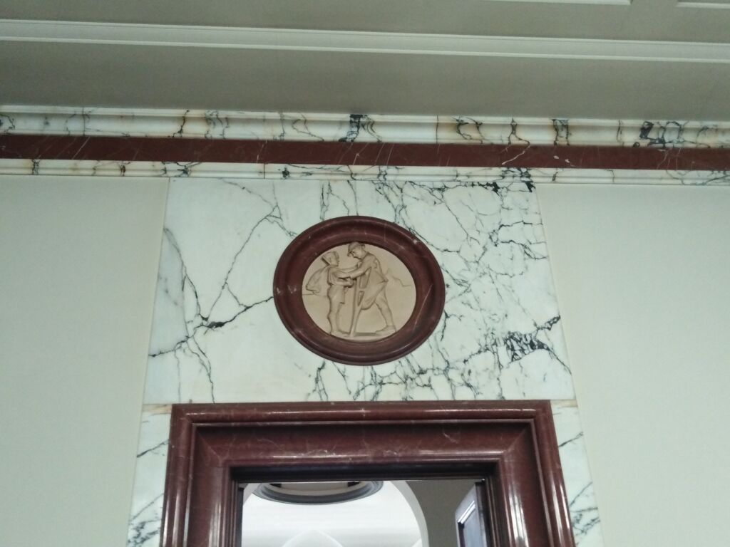 Bassorilievi in marmo rosa, cornici dei bassorilievi in granito rosa, cornici delle porte in marmo rosso, divisori posti sotto le vetrate in metallo, meccanismo della vetrata con corde e pulegge, panca a parete in legno massello, rivestimento della pareti in marmo, vetrata in metallo e vetro piombato, tessere di vetro colorato della vetrata unite da un profilato di piombo, sedie in legno e pelle, targa esterna in metallo, tavolo in legno