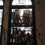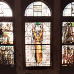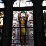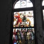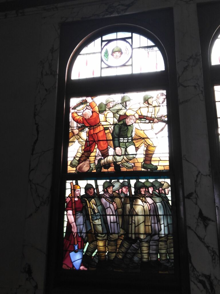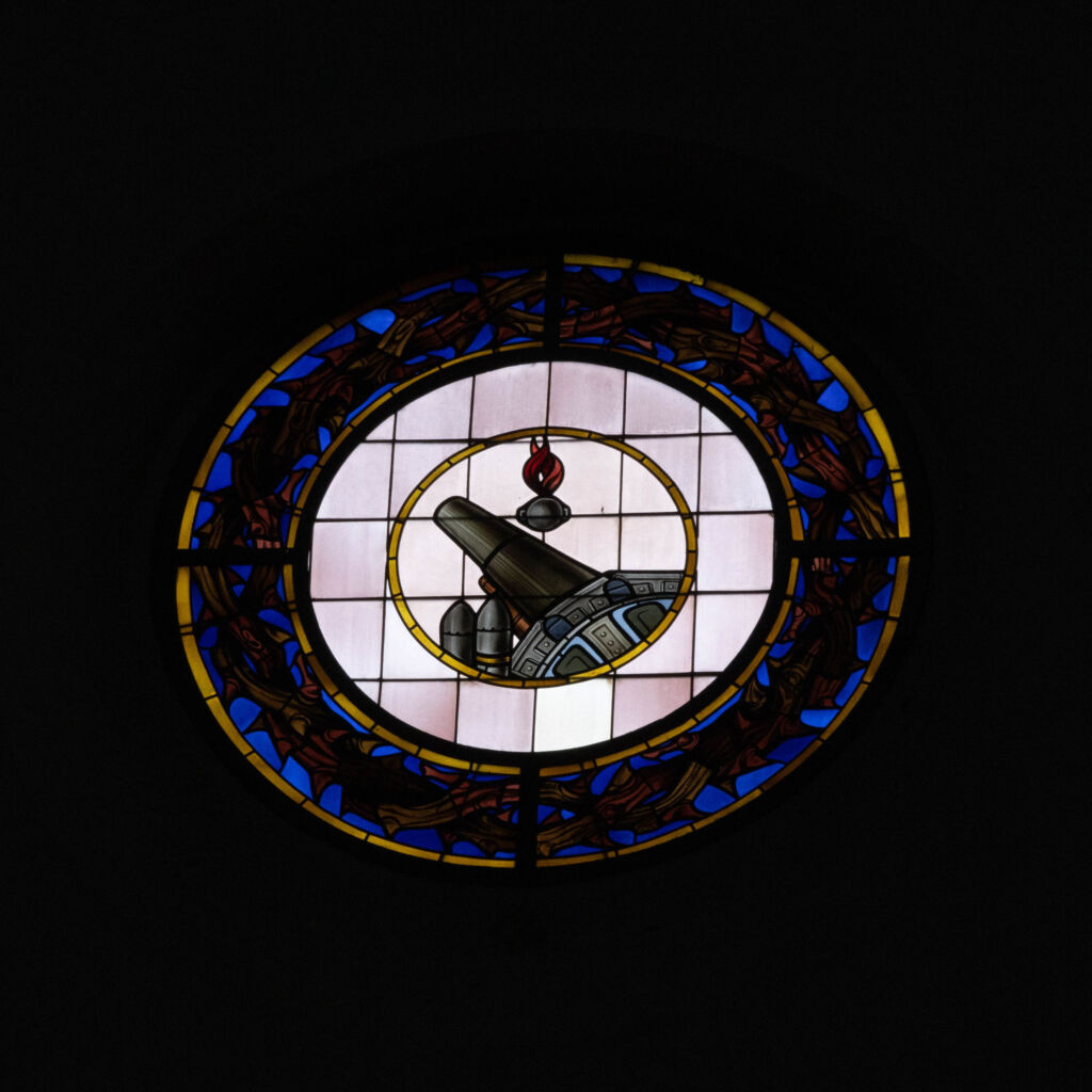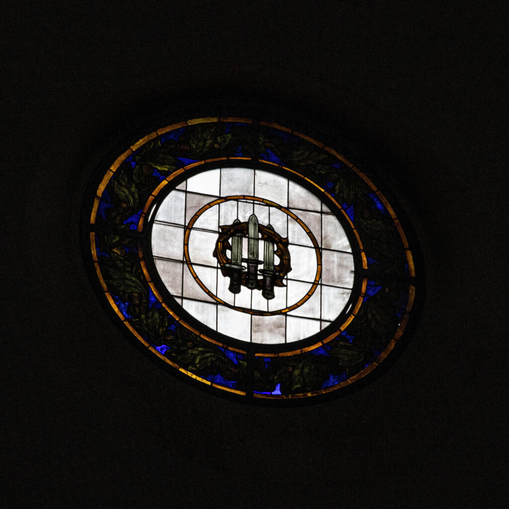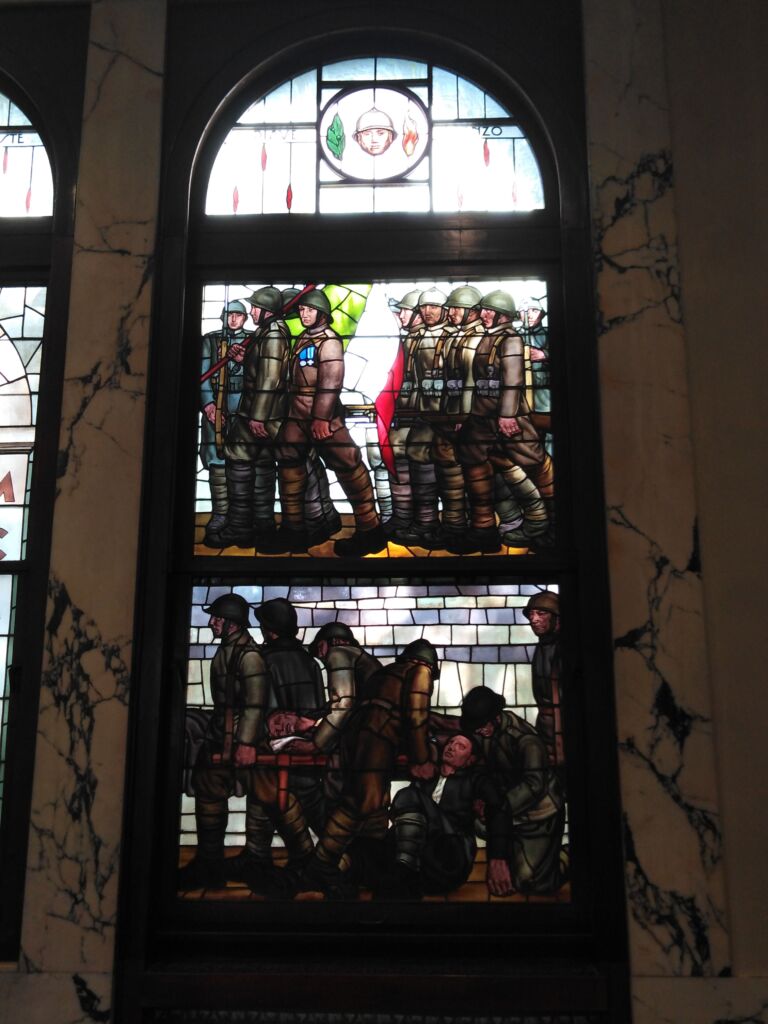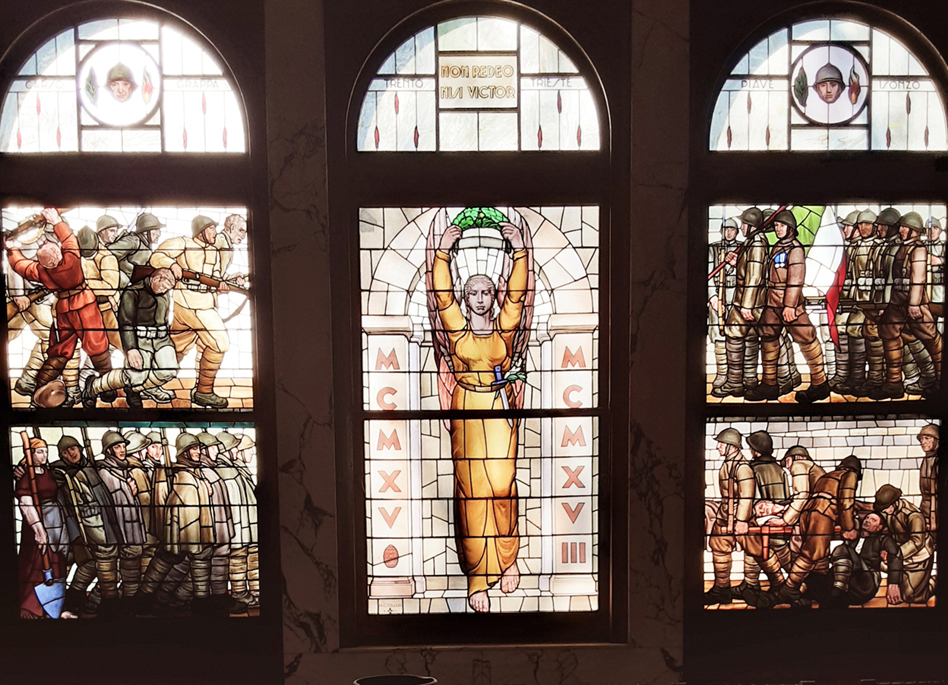 Sulle vetrate i simboli riportati fanno riferimento agli invalidi e i mutilati della Grande Guerra.
