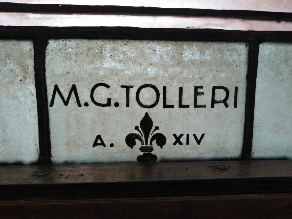 3 - nella vetrata 3 è visibile un labaro nero (vessillo con asta trasversa e drappo quadrato), simbolo della milizia (Legioni), che era, negli anni Trenta del Novecento, una delle forze armate dello Stato;
