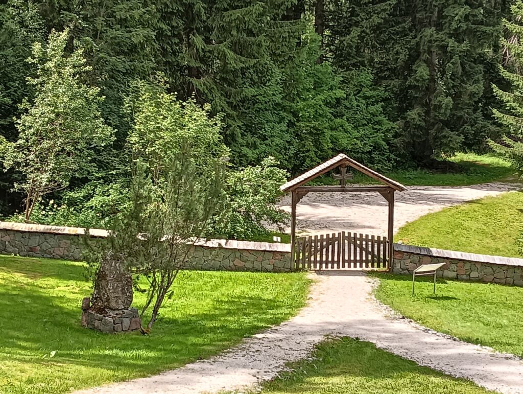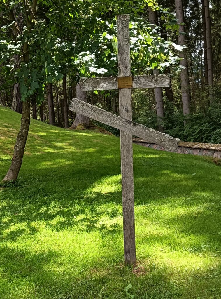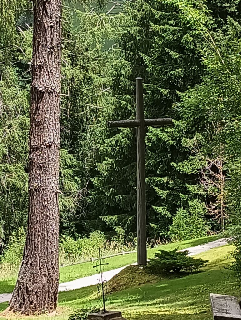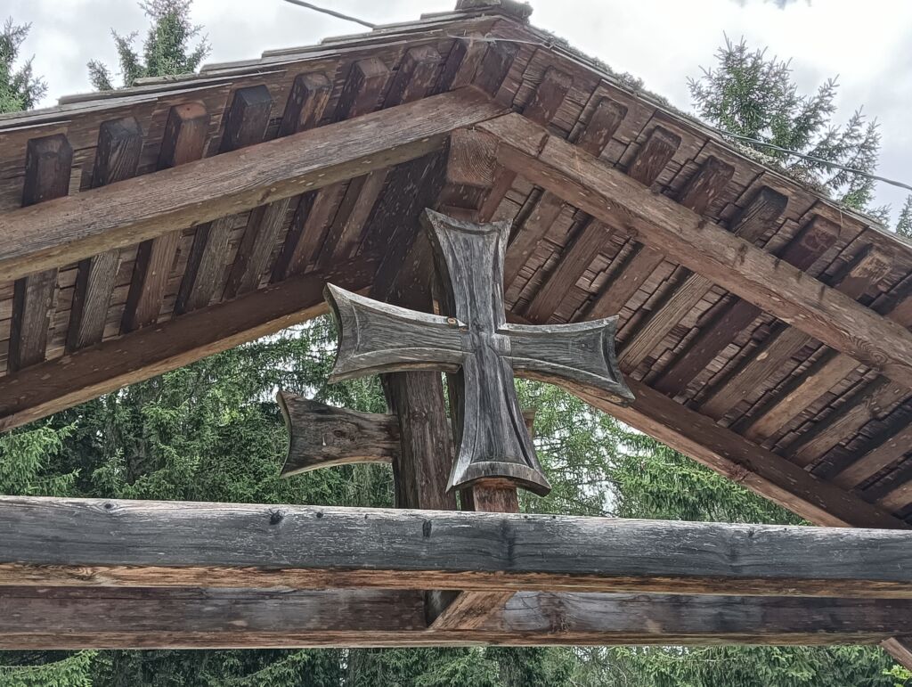 La croce a loro dedicata ricorda la Croce ortodossa russa, ma a differenza di quest’ultima manca il braccio orizzontale nella parte più alta. Può essere che si sia staccato a causa della fragilità cui va incontro il materiale ligneo sottoposto da quasi un secolo alle intemperie.