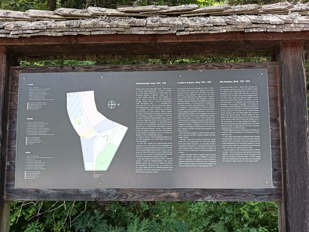 Il Cimitero austro-ungarico Burg è un ampio appezzamento di collina nei pressi di San Candido (BZ), raggiungibile e visitabile a piedi grazie agli spaziosi sentieri che percorrono il Memoriale. L’area è cintata con muretto a secco in pietra lungo tutto il suo perimetro. L’ingresso è attraverso un cancello in legno, sormontato da una tettoia sotto cui sui due accessi c’è, intagliata nel legno, una Croce a braccia uguali che si allargano verso l’esterno, detta Croce Patente.