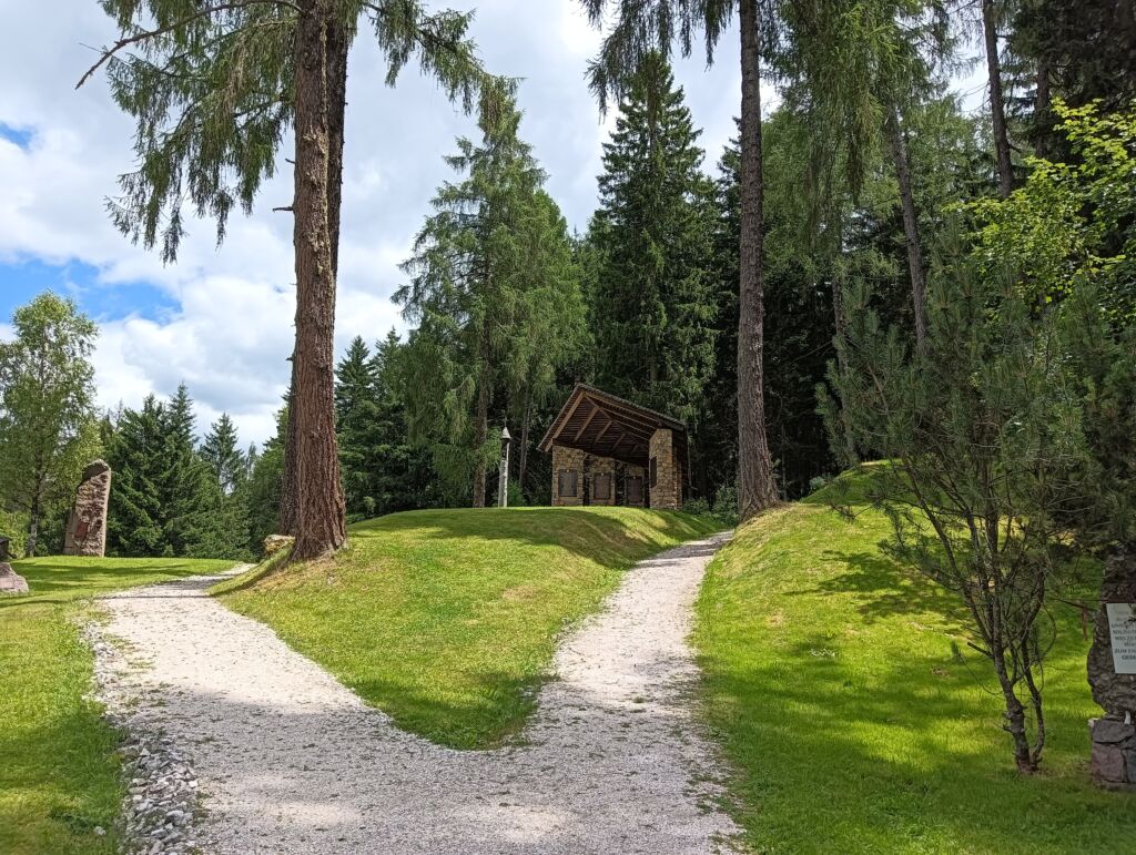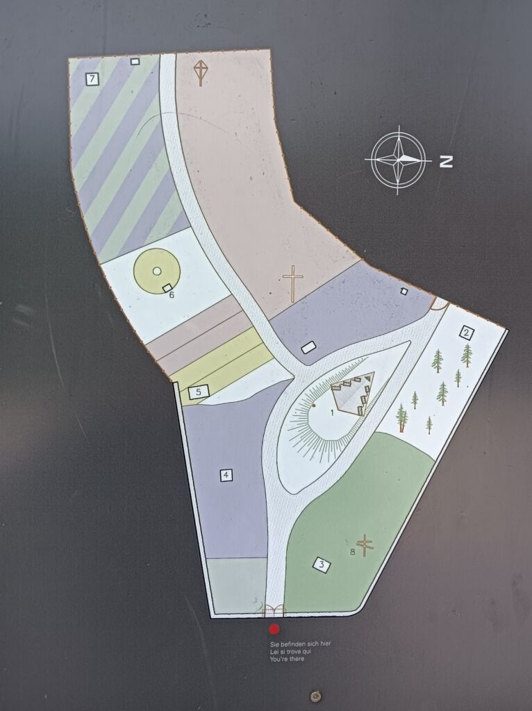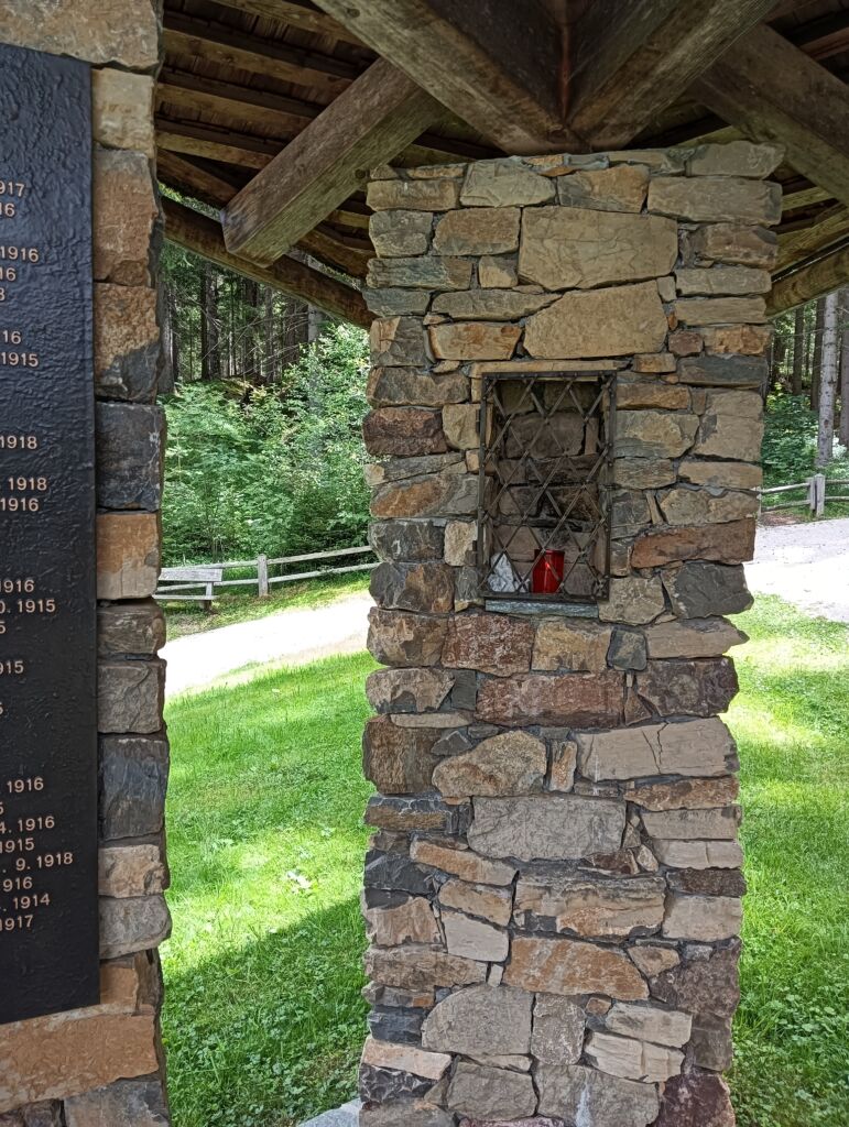 Poco dopo l’ingresso, sulla destra, c’è la Cappella commemorativa. Essa è in pietra a vista, ed è composta da un basamento e da sei colonne disposte tre per lato, a lisca di pesce, più una terminale come vertice del virtuale triangolo. Le colonne reggono un tetto a capanna, composto da una intelaiatura in legno ricoperta da tegole. Quando, a partire del 1934, le salme furono riesumate dal cimitero e trasferite altrove, l’area e la cappella subirono un degrado importante. Ma, con il recupero del 2003/2004, la cappella fu riedificata secondo il progetto originale dell’architetto Bernhard Lösch.