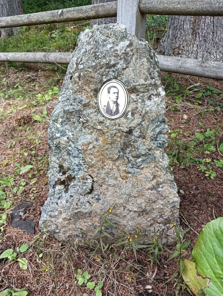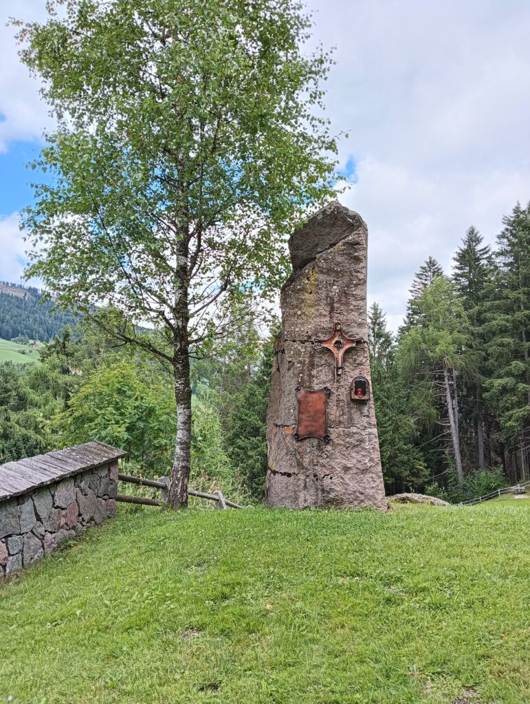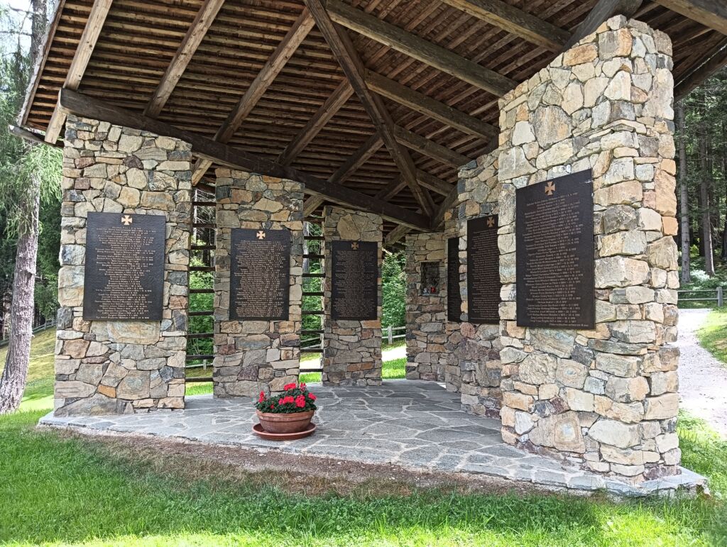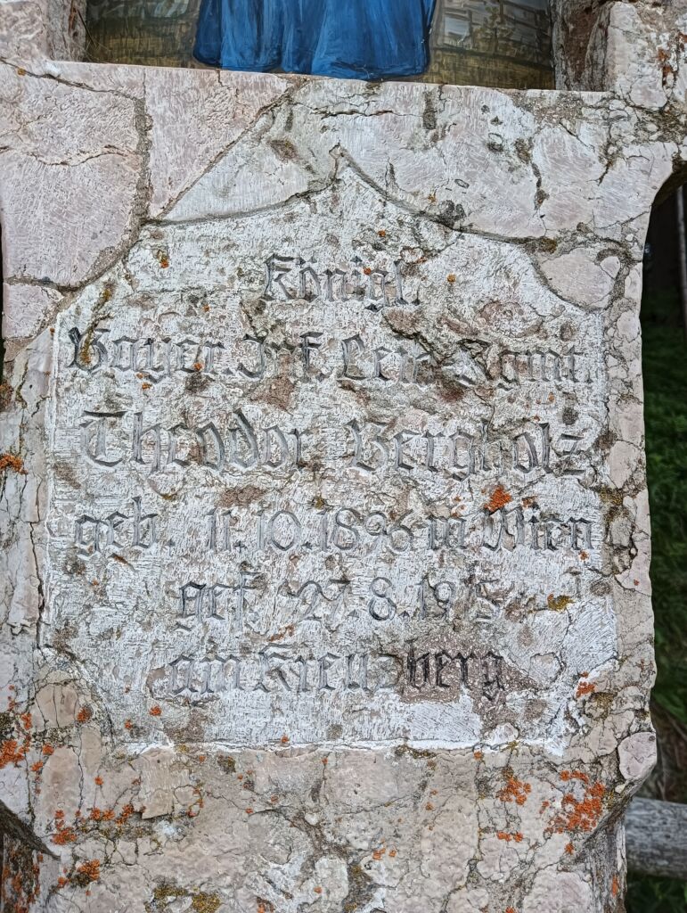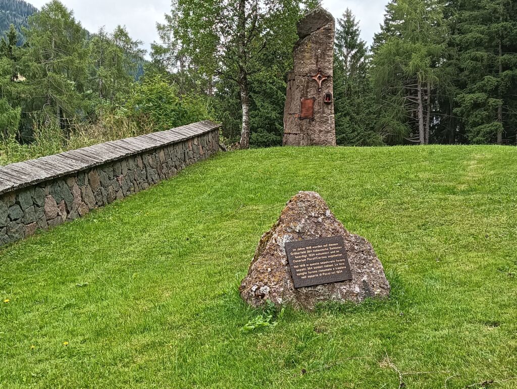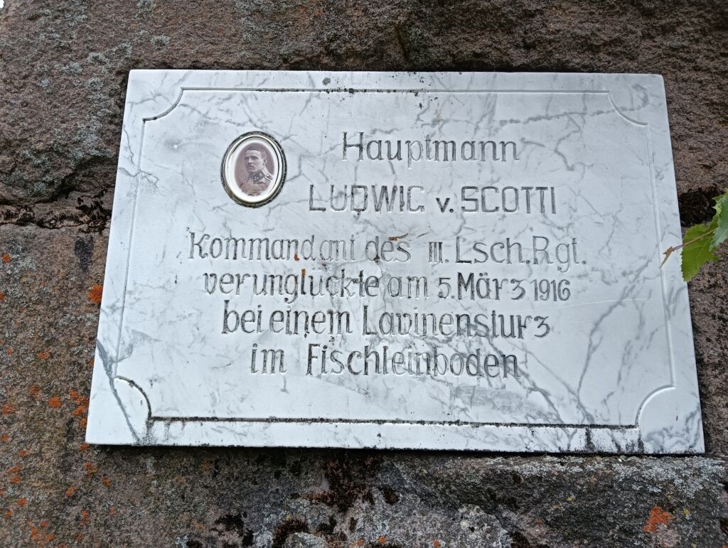 La scritta ricorda che il Capitano era al comando del III Regg. Landsturm quando, il 5 marzo 1916, perì a causa di una valanga nel piano di Fischleinboden, nei pressi di San Candido.