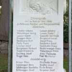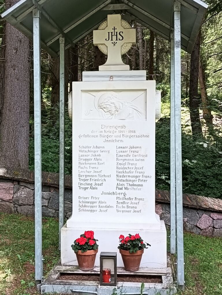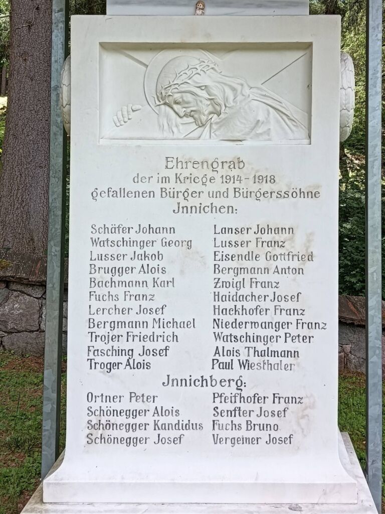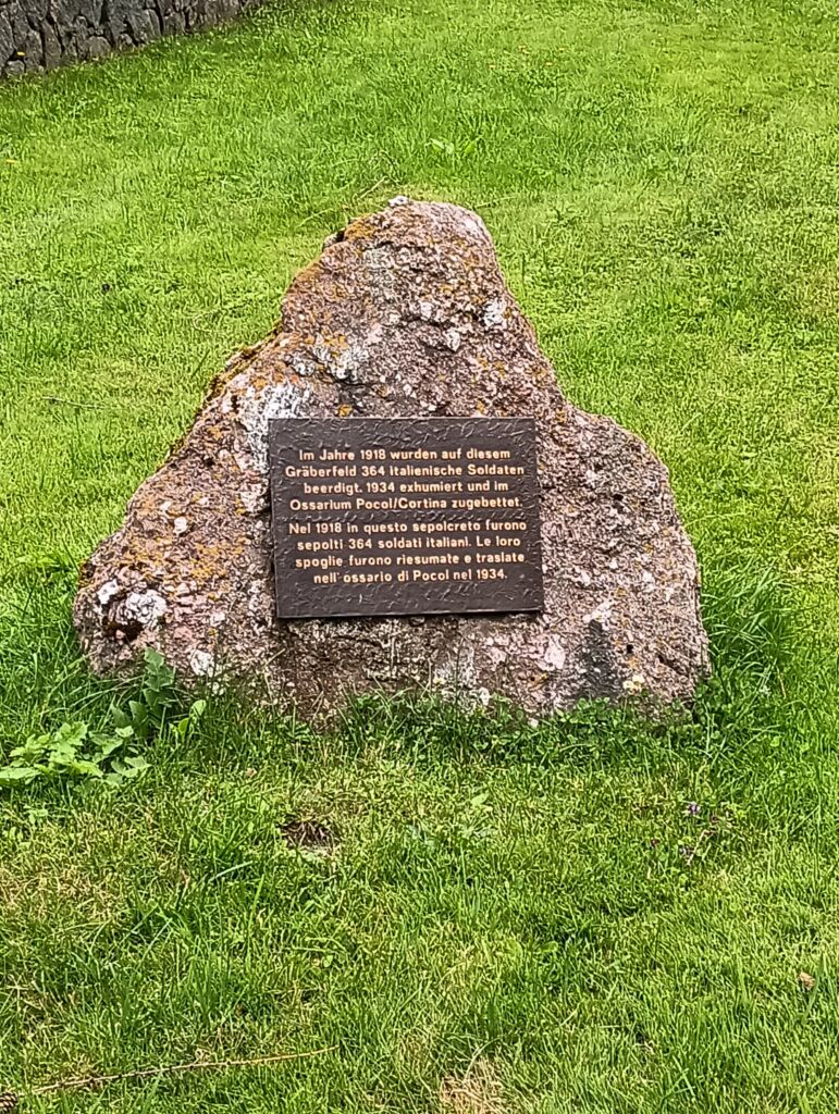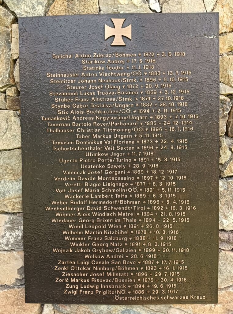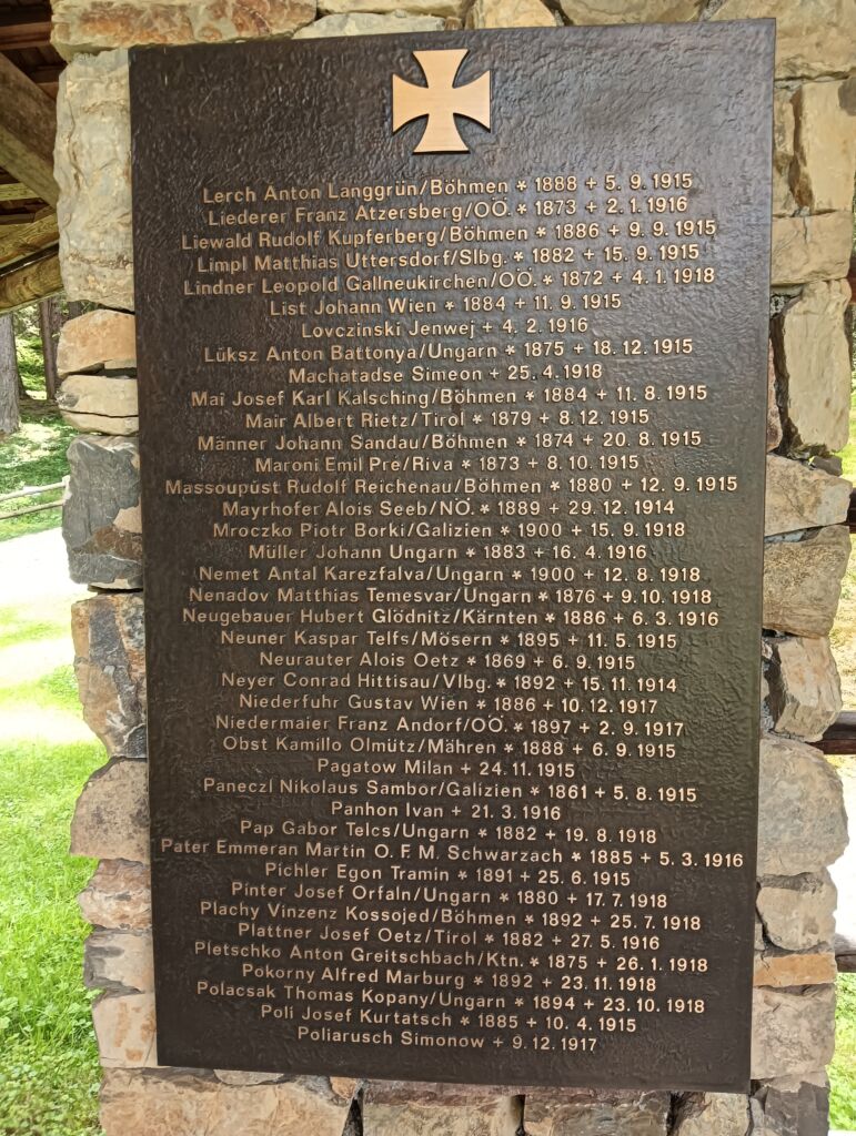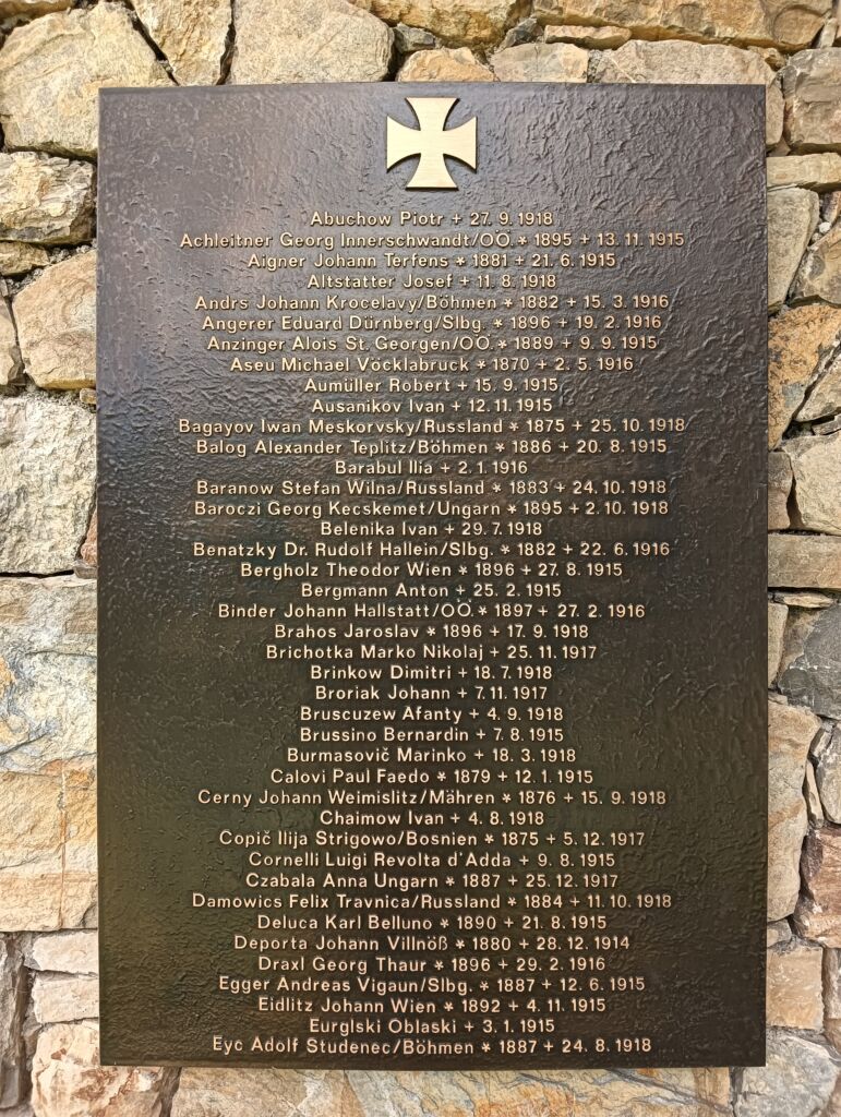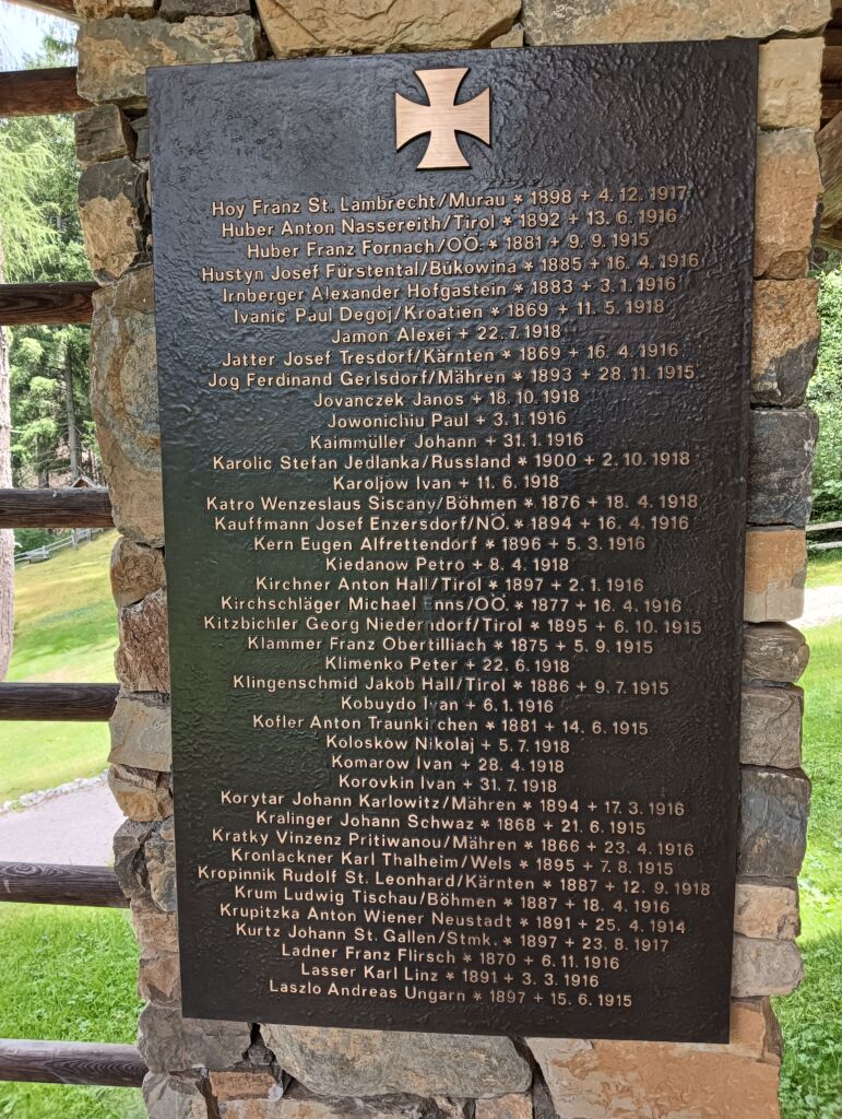 Hier ruhen 520 Soldaten der österreichisch-ungarischen Armee, darunter Bosniaken, italienische, rumänische, russische und serbische Kriegsgefangene, weiters in einem Massengrab unbekannt Gefallene.