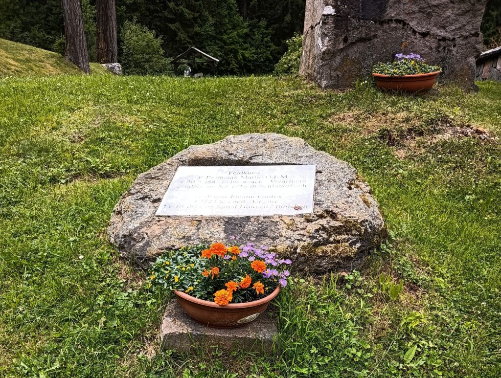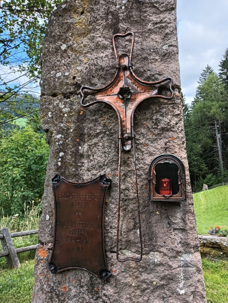 Durante la Grande Guerra, i cappellani militari svolsero un ruolo cruciale come figure di riferimento spirituale e morale per i soldati. Essi furono presenti sia al fronte sia negli ospedali, assistendo religiosamente le truppe, confortando i moribondi e dando l’ultima benedizione. Al cimitero di Burg, due di essi sono ricordati, in quanto caduti, con una targa su pietra naturale che recita: