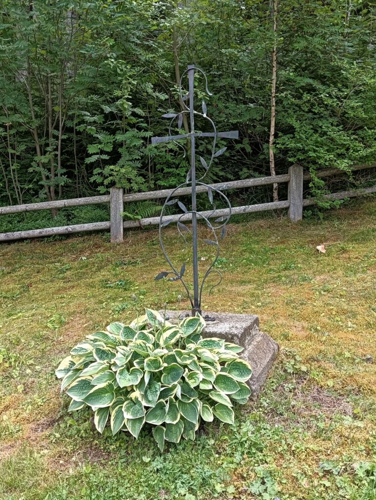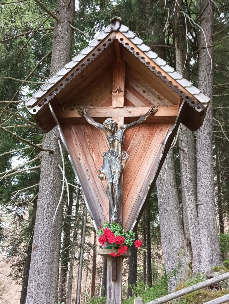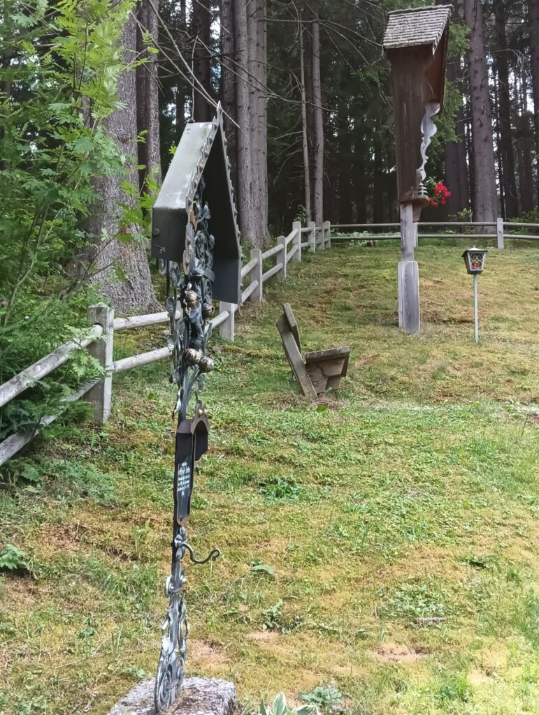Il cippo dedicato al Soldato Semplice Gottfried Hofer è un crocefisso in ferro battuto, finemente lavorato con volute, fiori e foglie. Sul gambo che sorregge la composizione c’è la targa, nera, con scritta dedicatoria in bianco: