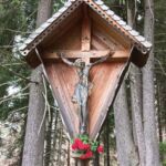Il cippo è in legno intagliato, con una croce che all’incrocio delle braccia porta una tavoletta in legno pregevolmente intagliata, raffigurante la Parabola del Buon Samaritano.