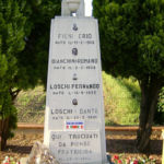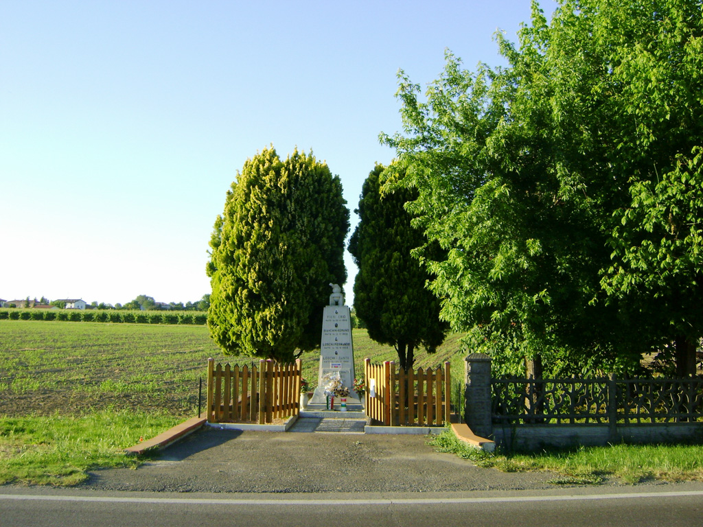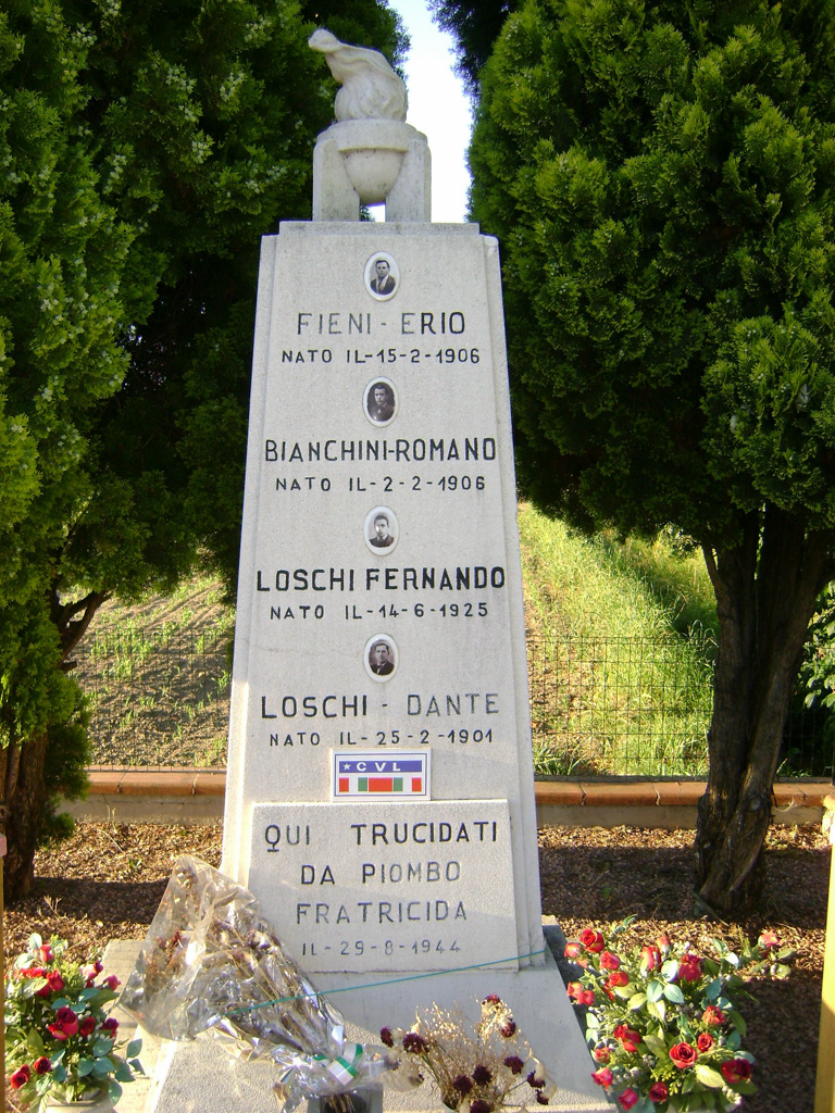 Cippo interamente in marmo, la cui parte superiore culmina in una lampada votiva dello stesso materiale. Vi sono riportati i nomi dei 4 Caduti con i dati anagrafici e le fotografie in ceramica. I caratteri che formano l’epigrafe sono incisi e riempiti con vernice di color nero. E’ posta anche la targhetta tricolore del CVL (Corpo Volontari della Libertà, l’organismo militare che raggruppava tutte le formazioni partigiane). Si trova in una piccola area protetta per tre lati da una recinzione metallica; la parte anteriore è costituita da una palizzata in legno con cancello a doppia anta. La parte prospiciente il cippo è pavimentata con formelle quadrate di pietrisco. Alla base del manufatto trovano spazio tre vasi portafiori: due laterali in marmo ed uno centrale, in pietra, dipinto con il tricolore dell’ANPI (Associazione Nazionale Partigiani d’Italia).
