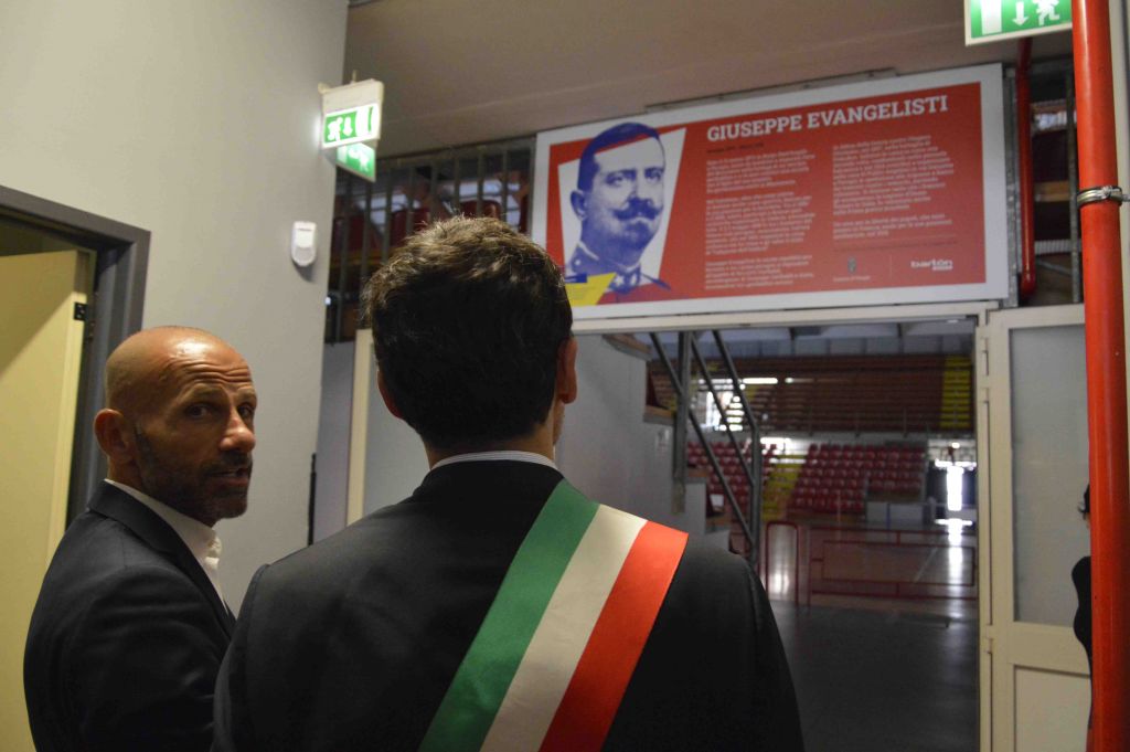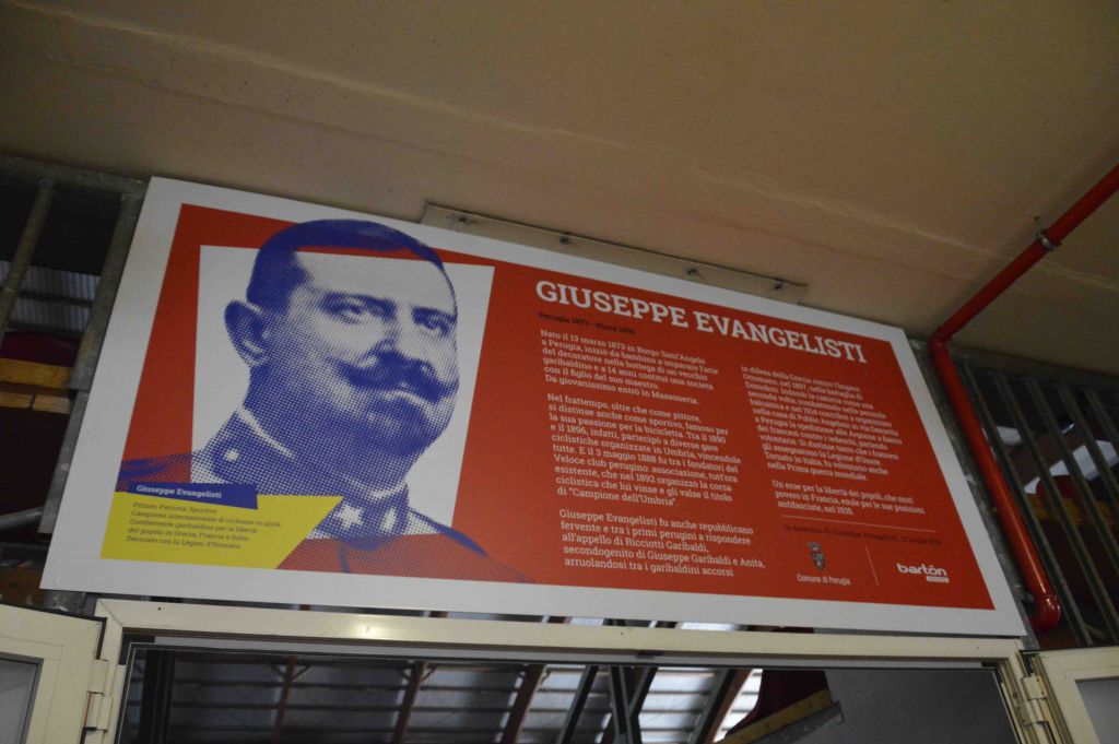 All'interno dell'impianto sportivo, lungo il corridoio dell’ingresso atleti che porta all’interno del palazzetto, è stata colocata una lastra di plexiglass che racconta la vita di Giuseppe Evangelisti, di cui è presente anche una immagine, così come trasmessa da una tradizione soprattutto orale: un modo, sottolineato dalla grafica fresca e diretta, per far approfondire in particolare ai giovani un personaggio che tanto ha dato alla storia di Perugia e d’Italia.