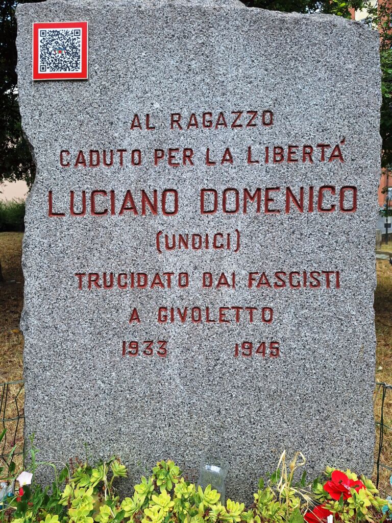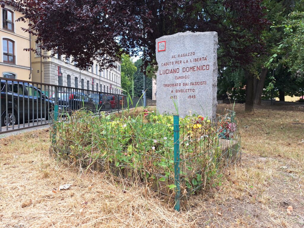 - Domenico Luciano nacque a Torino l’8 Dicembre 1933. Risiedette a Torino in via Exilles,82 e fu allievo della scuola Emanuele Filiberto duca d'Aosta. Durante la guerra di Liberazione suo padre e suo fratello furono partigiani e anche lui partecipò alla Resistenza come staffetta partigiana nella 2^ Divisione Garibaldi dal 7 settembre 1944 con il nome di battaglia “Undici” per la sua giovane età. Il 23 febbraio 1945 fu sorpreso, con il suo gruppo di partigiani, dai repubblichini in un cascinale nelle campagne di Givoletto. Iniziò un lungo conflitto a fuoco che durò sino a che i partigiani non ebbero finito le munizioni. Quindi fu deciso di far uscire il ragazzo e di fargli sventolare una bandiera bianca in segno di resa. Il ragazzo si tolse la maglietta bianca per agitarla ma fu raggiunto da una raffica di mitra e ucciso. Al giovane “Undici” sono dedicati anche i giardinetti ove è posto il cippo.