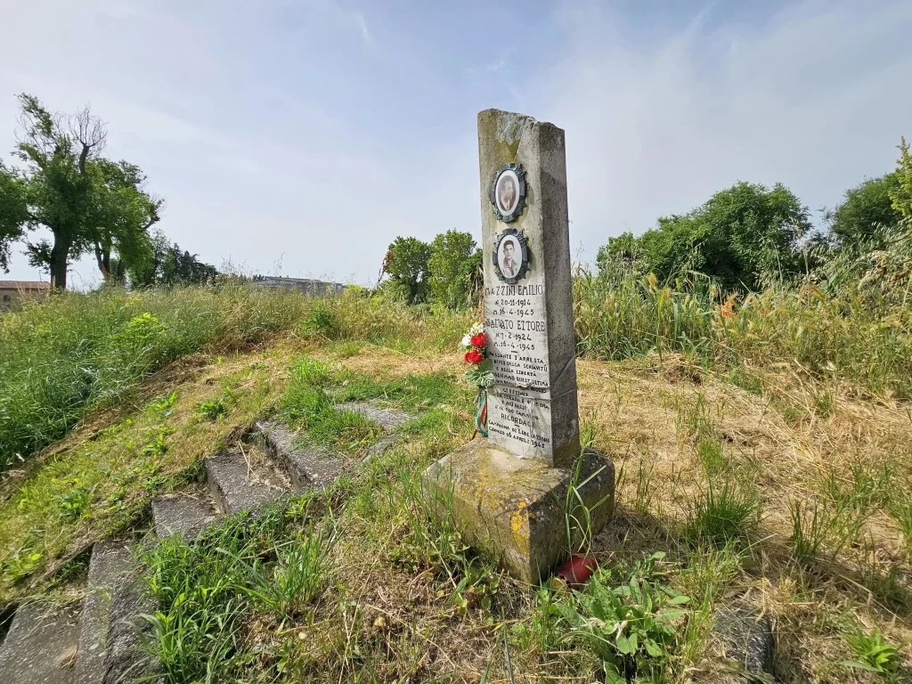 Il cippo è dedicato ai due partigiani garibaldini Emilio Mazzini ed Ettore Salvato, fucilati dai fascisti in questo luogo il 16 marzo 1945. Il cippo è costituito da una lunga e stretta lastra di marmo, a pianta rettangolare, con il vertice tagliato trasversalmente ed i lati che si restringono leggermente verso l’alto. L’epigrafe reca incisi i nomi dei due Caduti, in ordine alfabetico, con i relativi estremi anagrafici. I caratteri sono stati riempiti con vernice di colore nero. Nella parte superiore del cippo si trovano i fotoritratti in ceramica dei due partigiani (in alto quello del Mazzini e sotto quello del Salvato), racchiusi in una cornice ovale di bronzo. Lo zoccolo, realizzato in cemento, ha la forma di un parallelepipedo a base quadrata con sovrapposto un piccolo tronco di piramide.