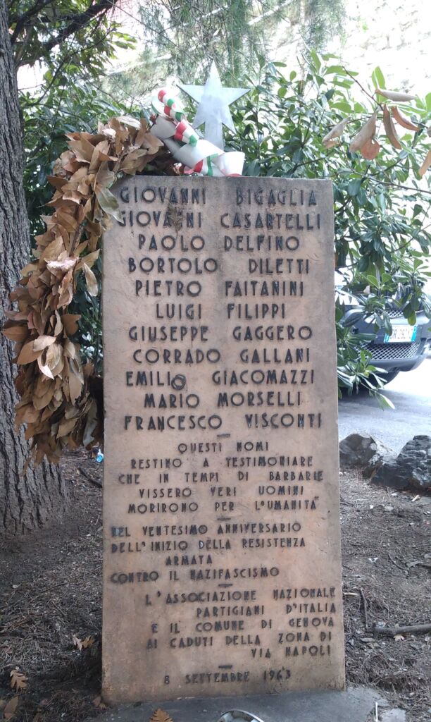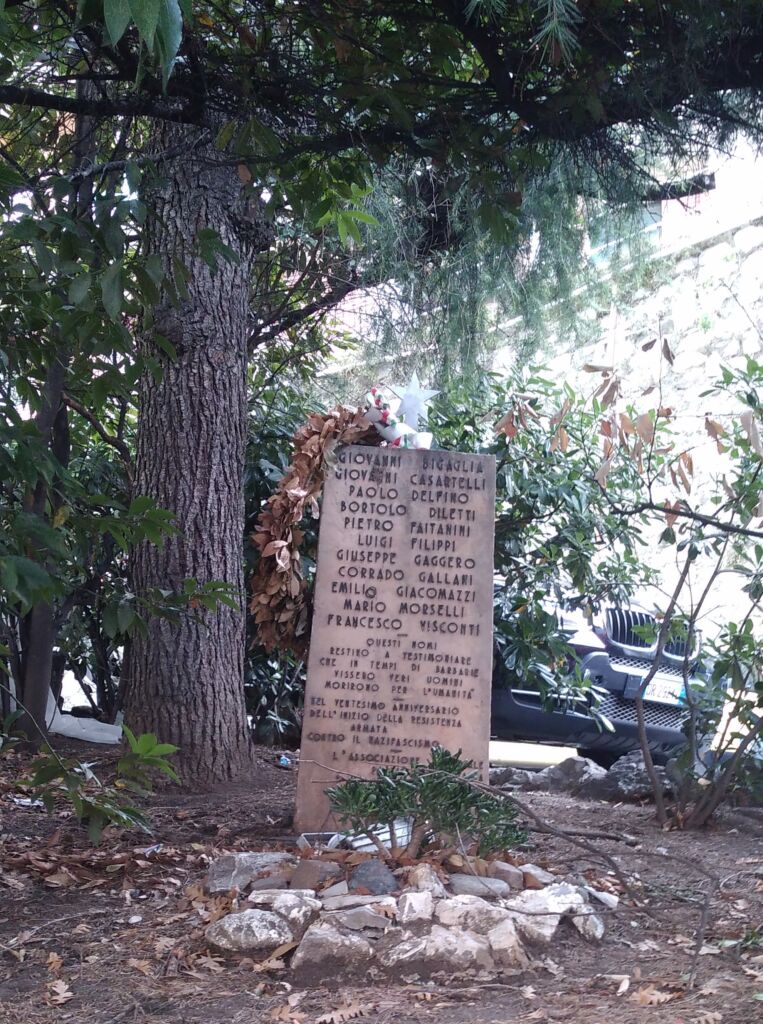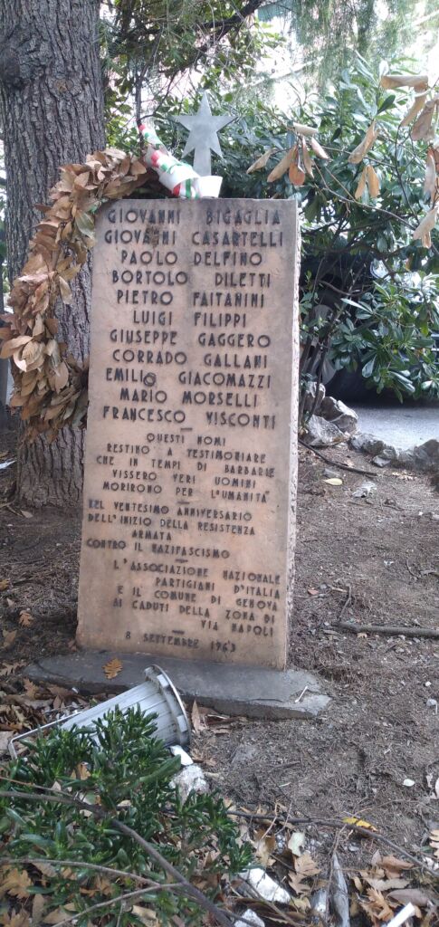 Il cippo, posizionato in un’area verde, ricorda alcuni nomi dei Caduti della zona di via Napoli.