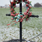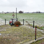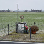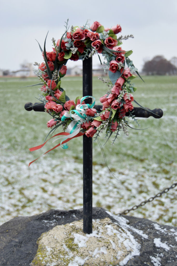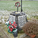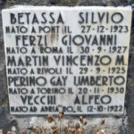 - Cippo in pietra; lastre in marmo; lettere in bronzo. Area di rispetto pavimentata con autobloccanti e parzialmente recintata con catene in ferro battuto; supporto per corone e croce metallici.
