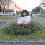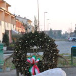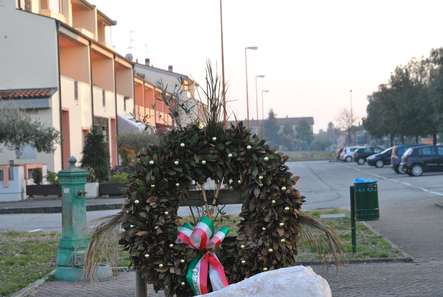 Il cippo si trova in un’aiuola fra piante rossicce e rosmarino, è di marmo bianco con venature rosa salmone. Nella parte posteriore si trova una corona d’alloro abbastanza grande con la fascia tricolore che riporta la scritta “Quartiere ravennate”, sorretta da una struttura di pali di legno.